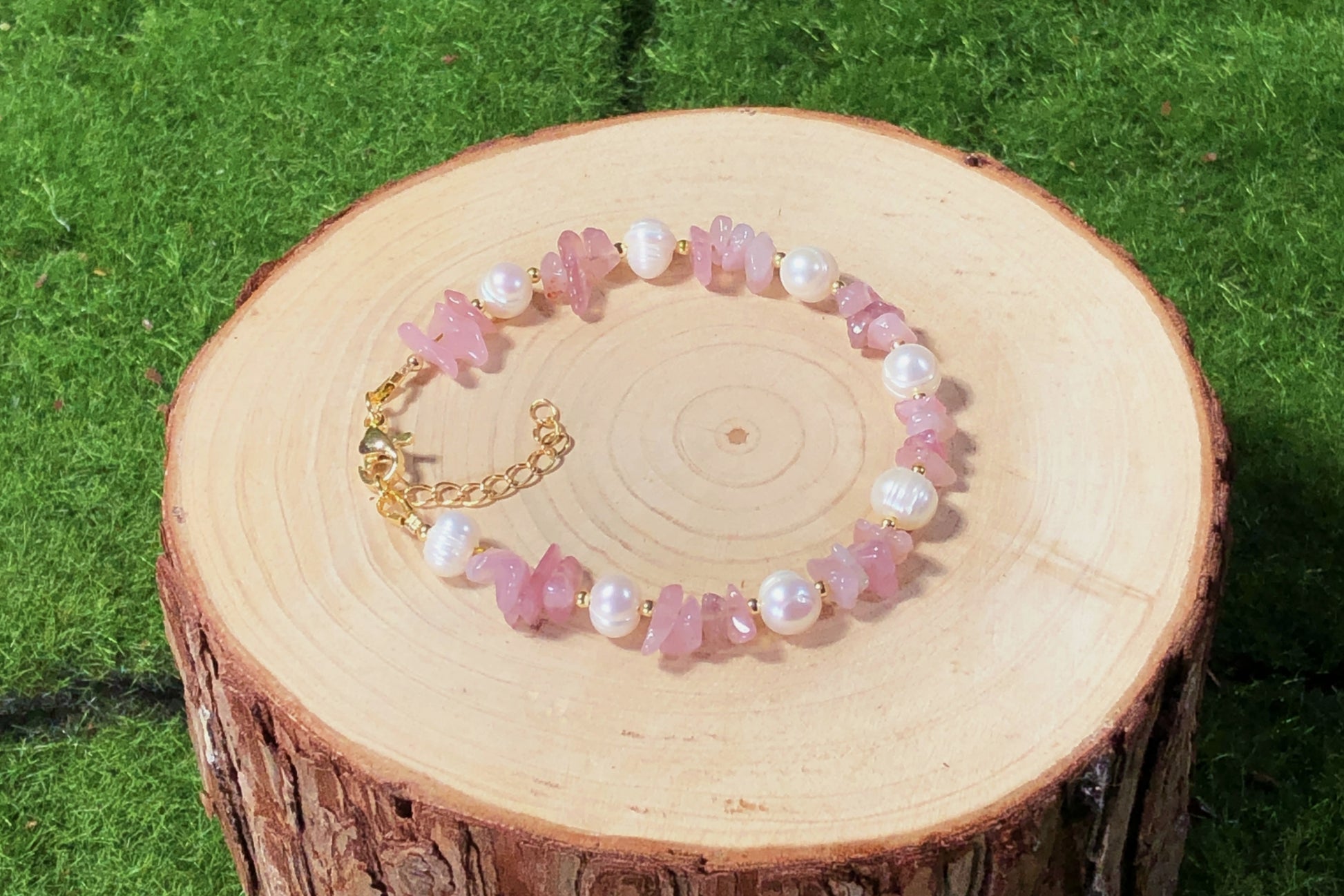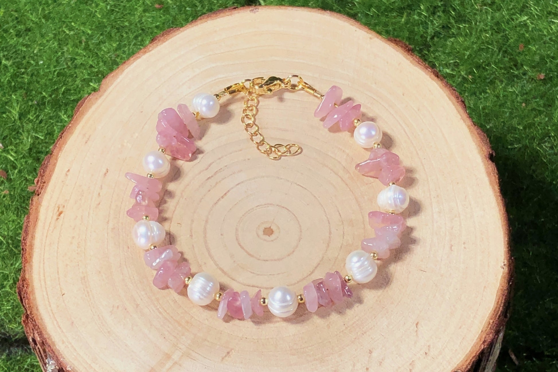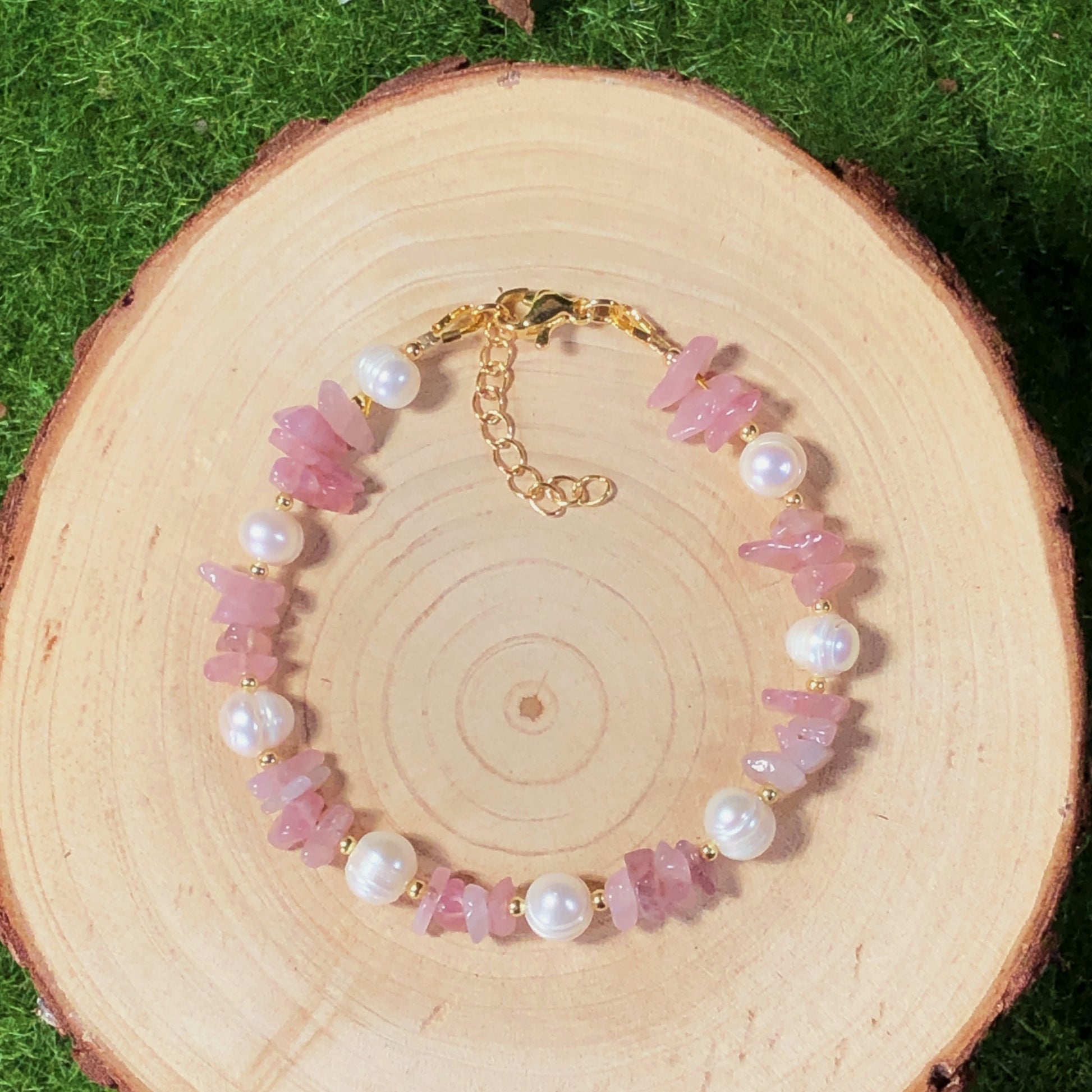 Armband aus natürlichen Süßwasserperlen und Rosenquarz, Kette aus 14-karätig vergoldetem Messing, handgefertigt.