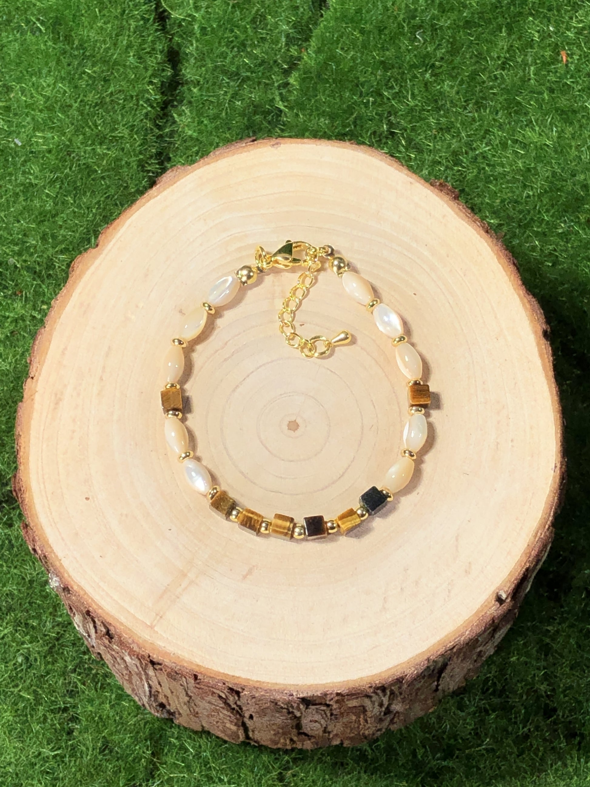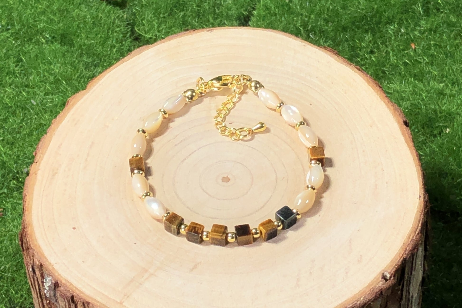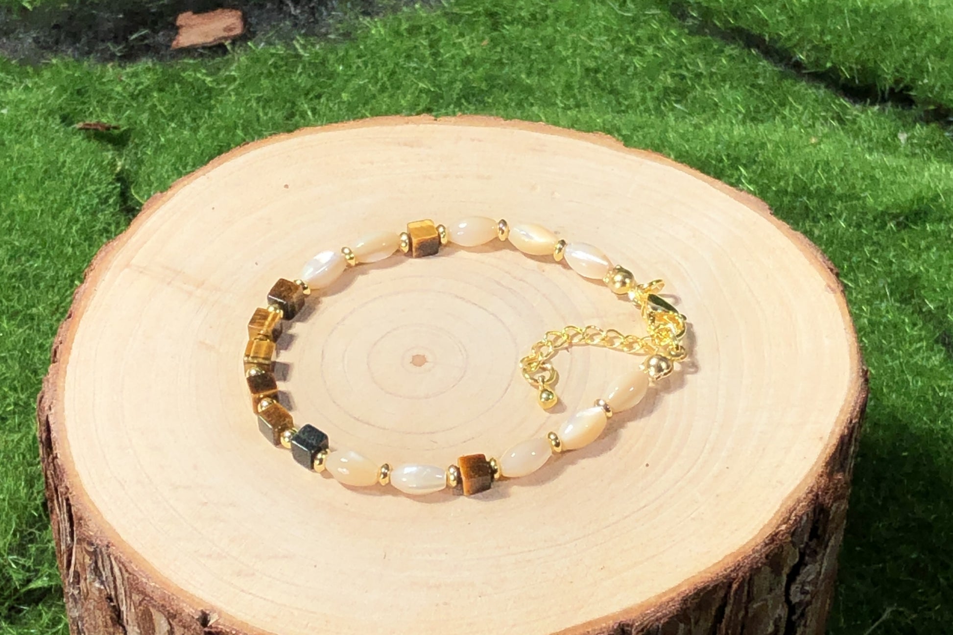 Armband aus natürlicher Tigeraugenmuschel, kupferplattiert mit 14-karätigem Gold, handgefertigt.