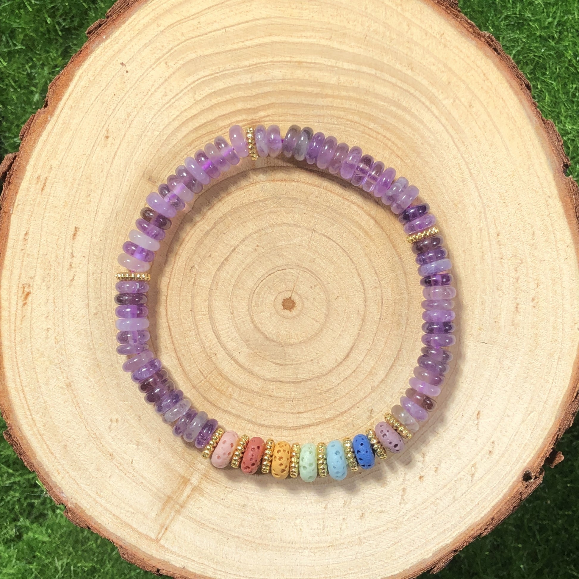 Armband aus vulkanischem Gestein und natürlichem Amethyst, kupferplattiert mit 14-karätigem Gold, handgefertigt.