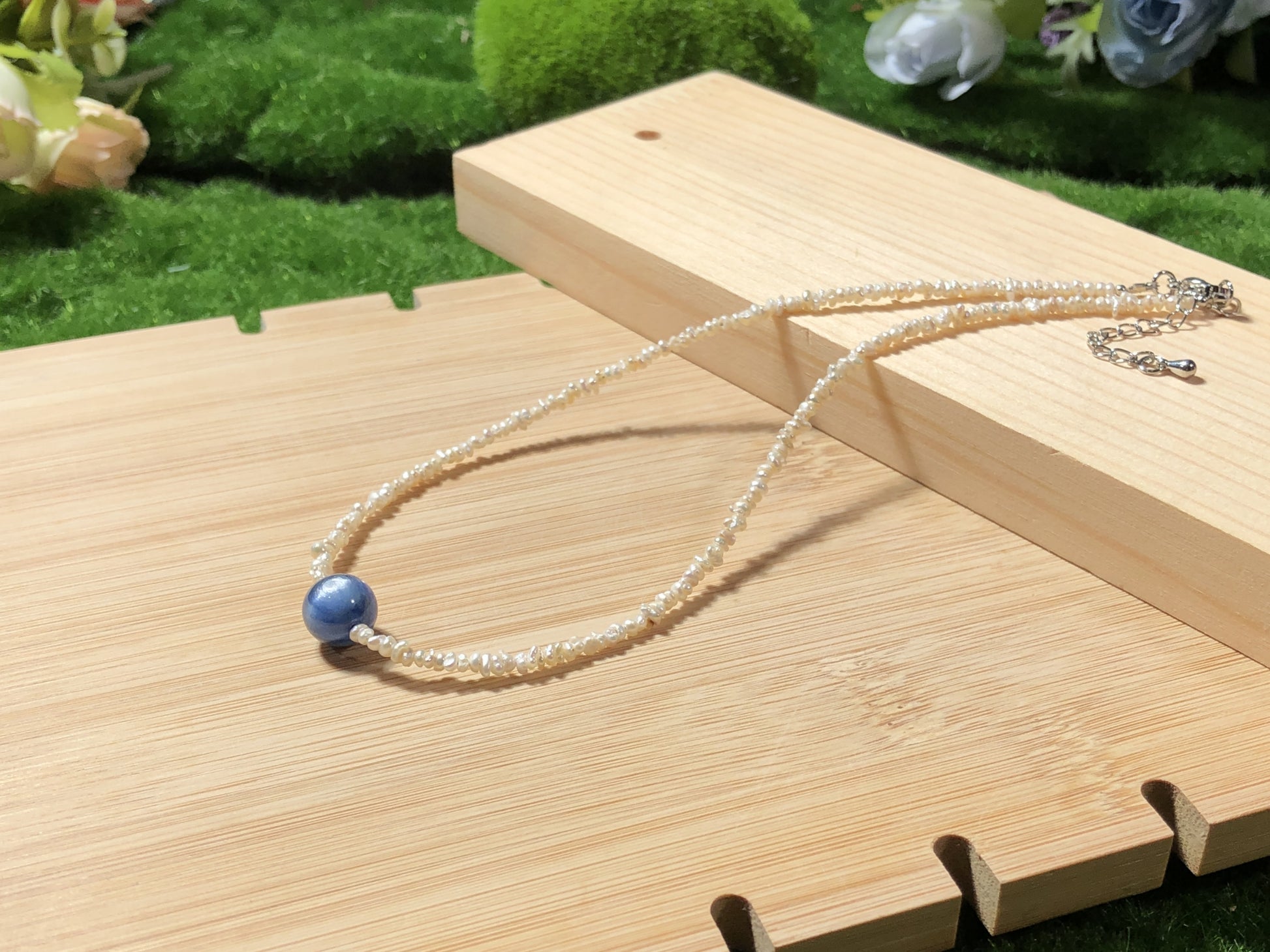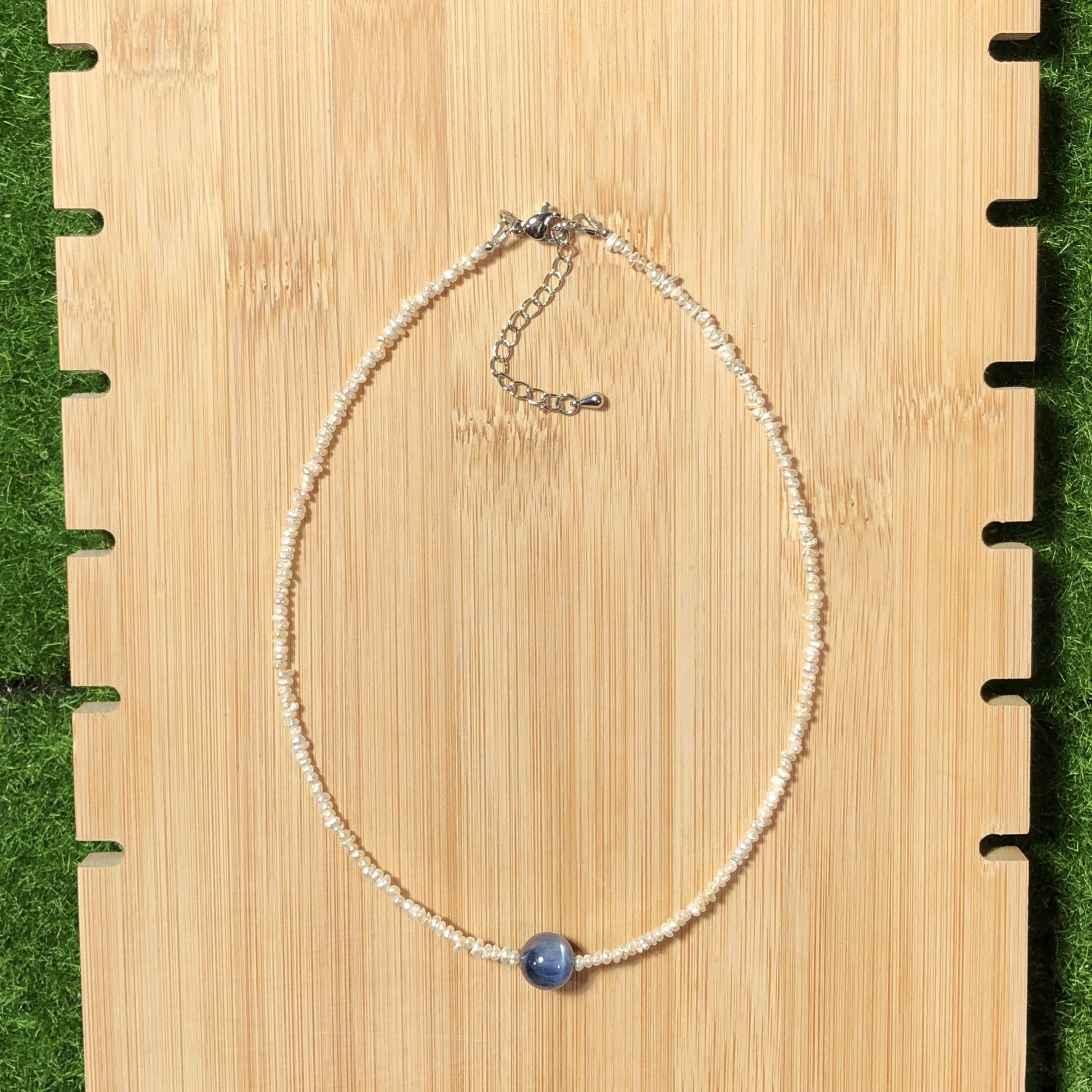Eine handgefertigte Halskette aus natürlichen Süßwasserperlen und blauen Kristallen, aus mit 14-karätigem Gold plattiertem Kupfer.