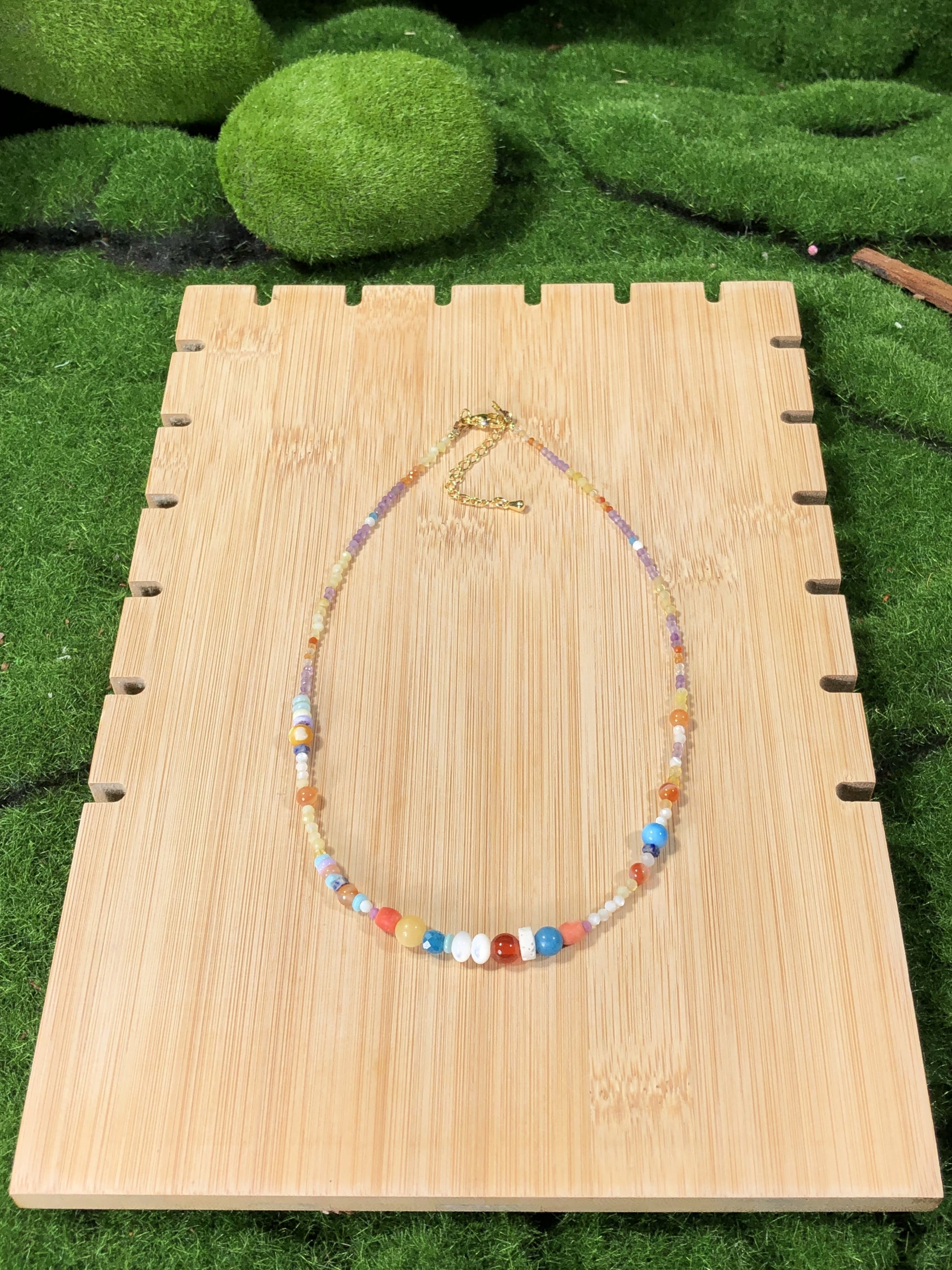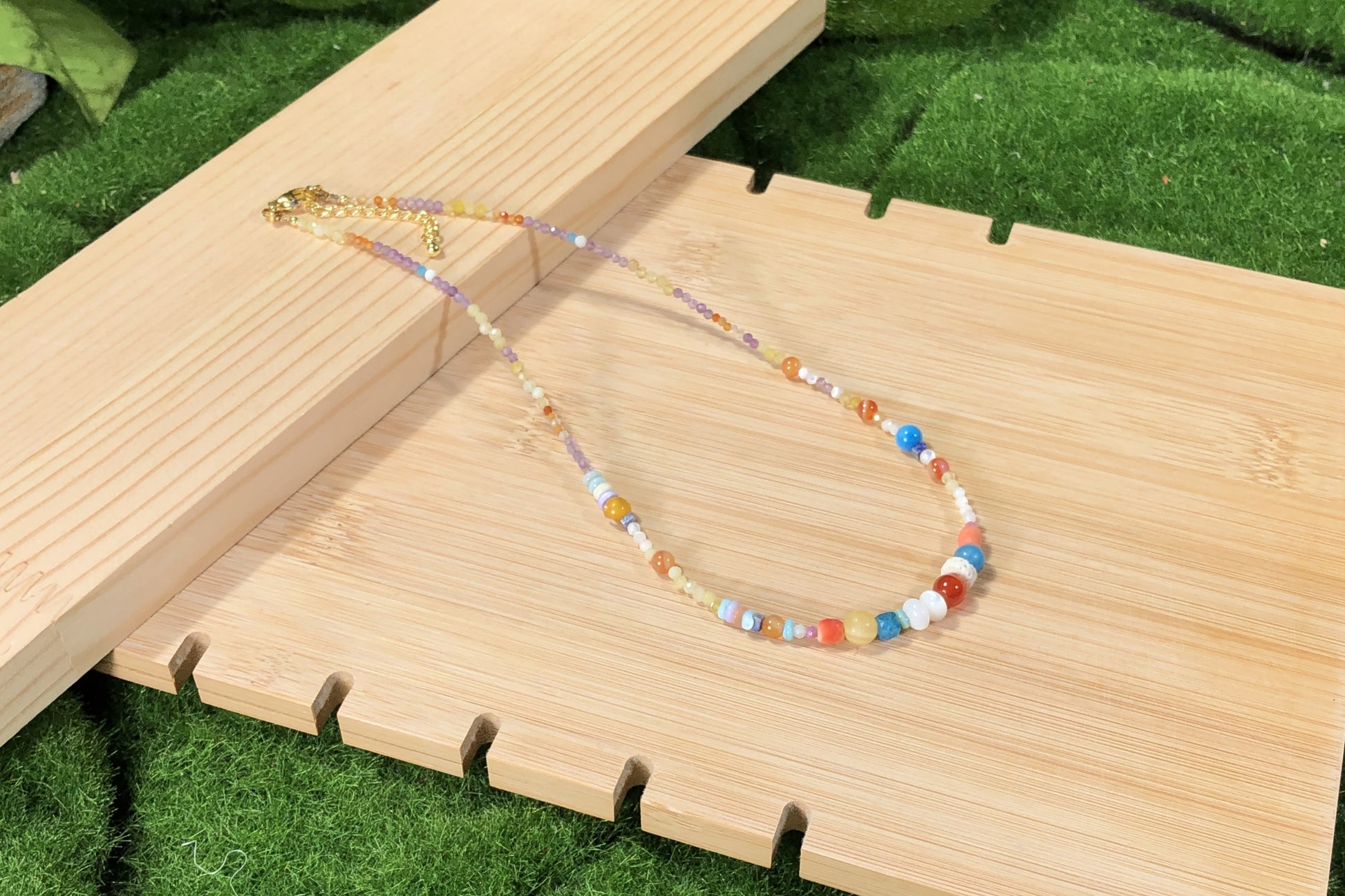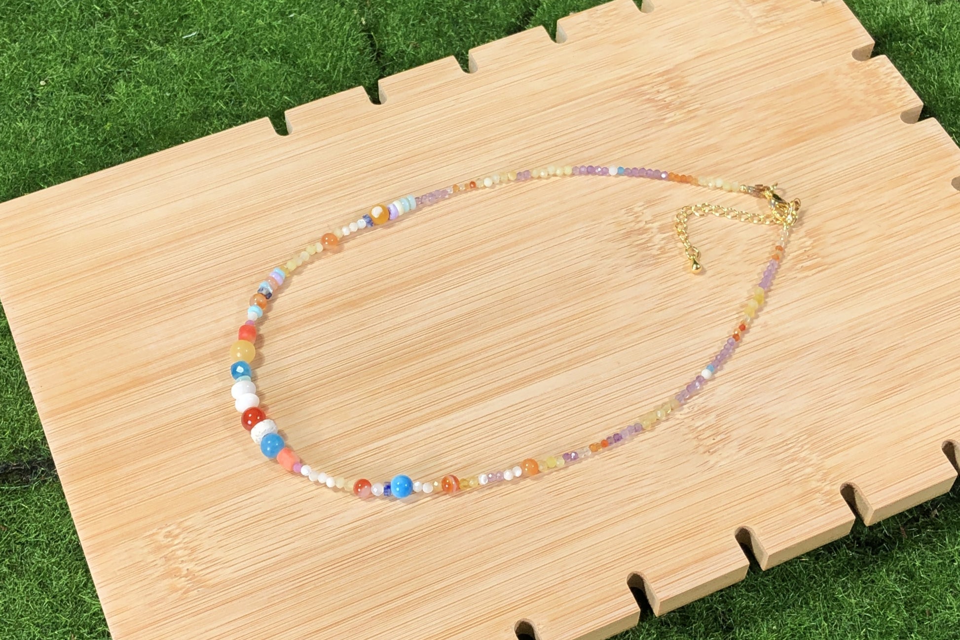 Eine handgefertigte Halskette mit Kristall, Achat und anderen farbigen Edelsteinen.