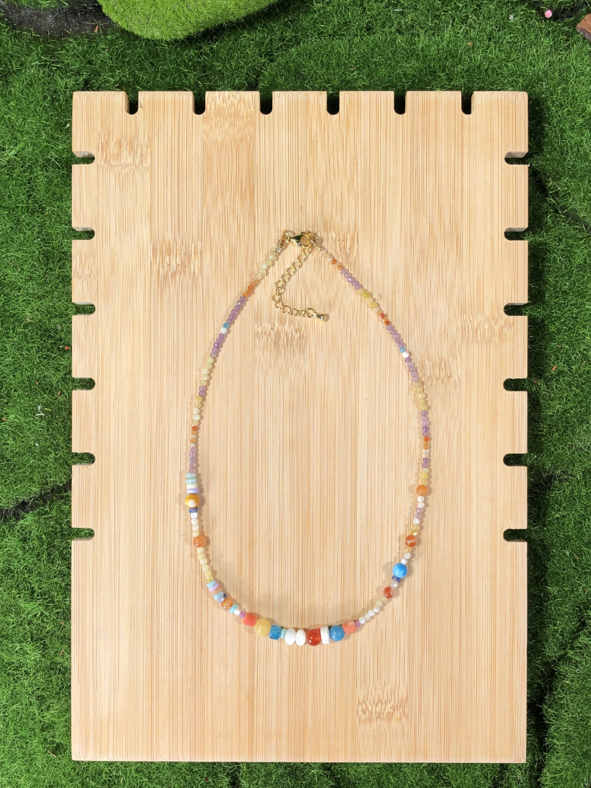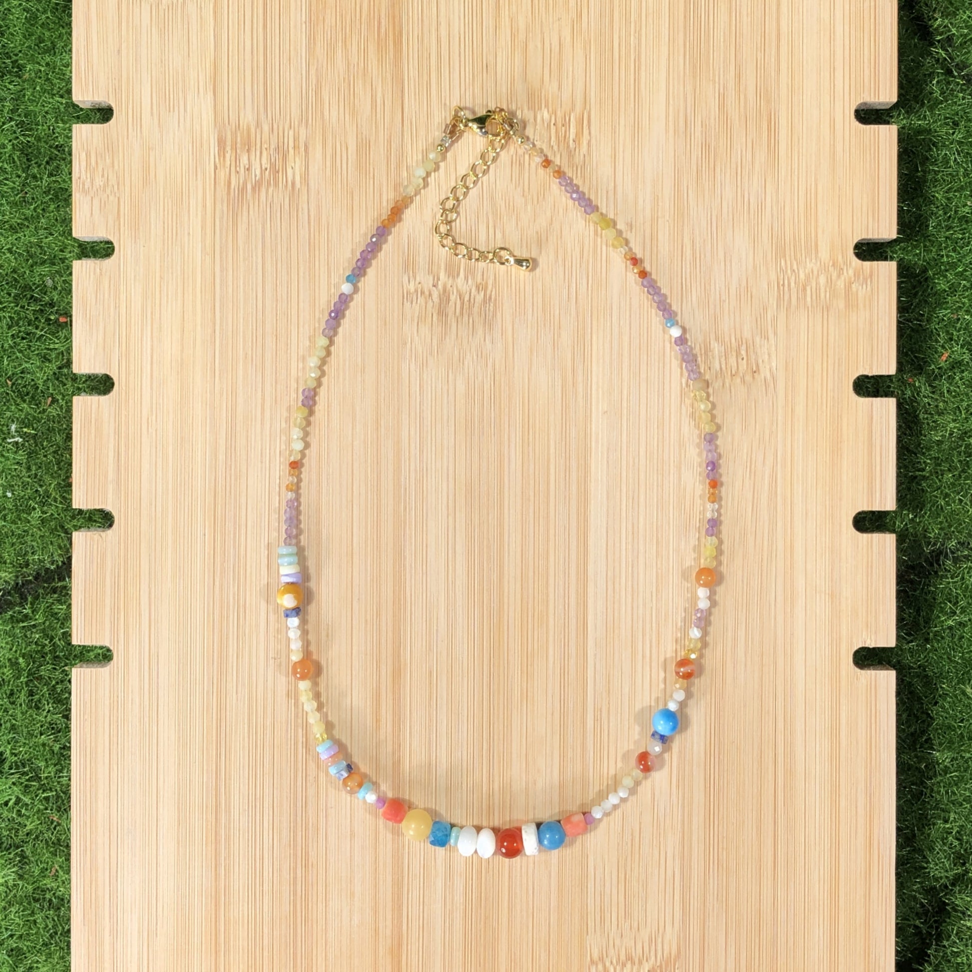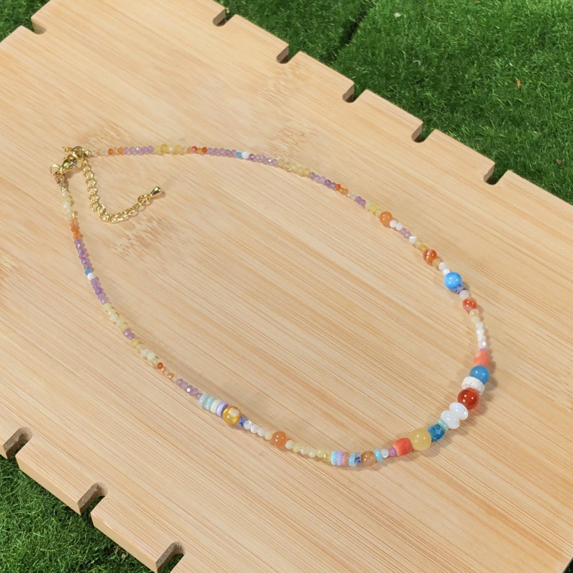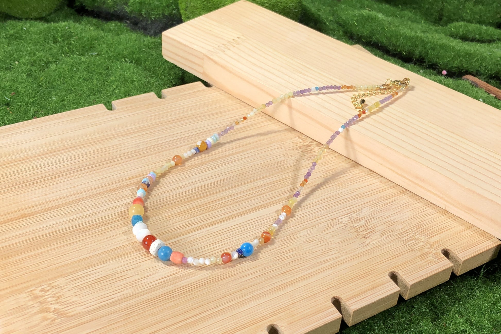 Eine handgefertigte Halskette mit Kristall, Achat und anderen farbigen Edelsteinen.