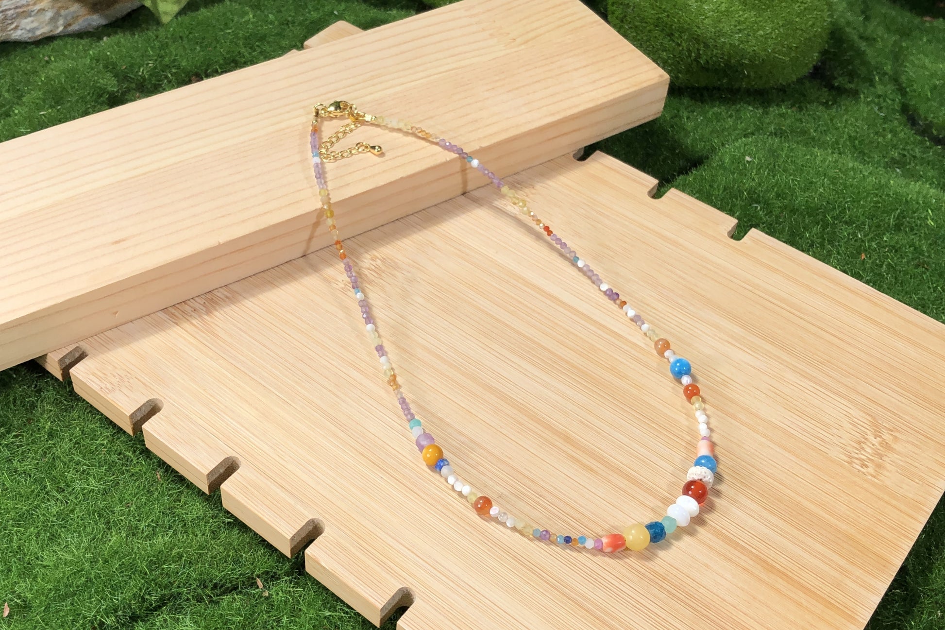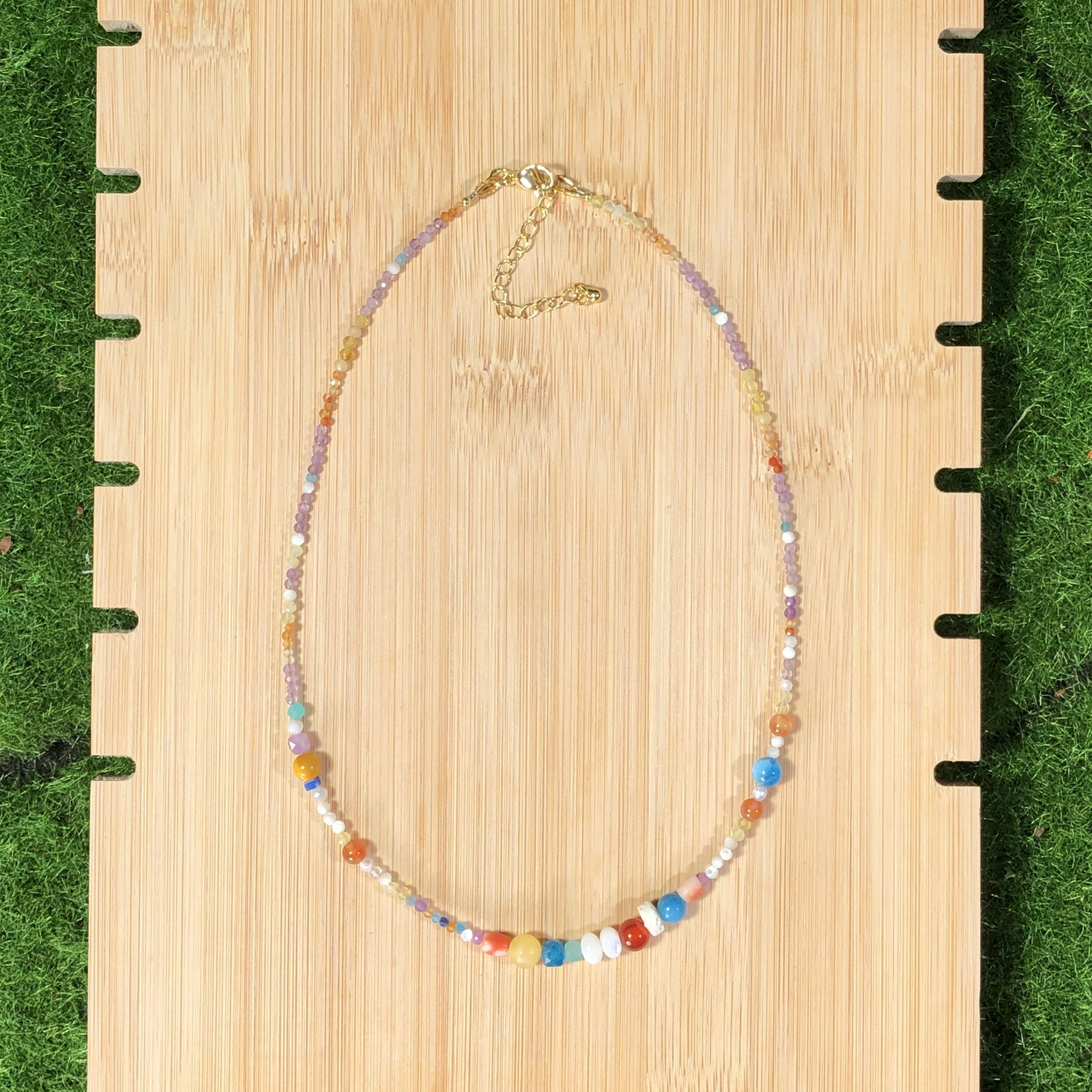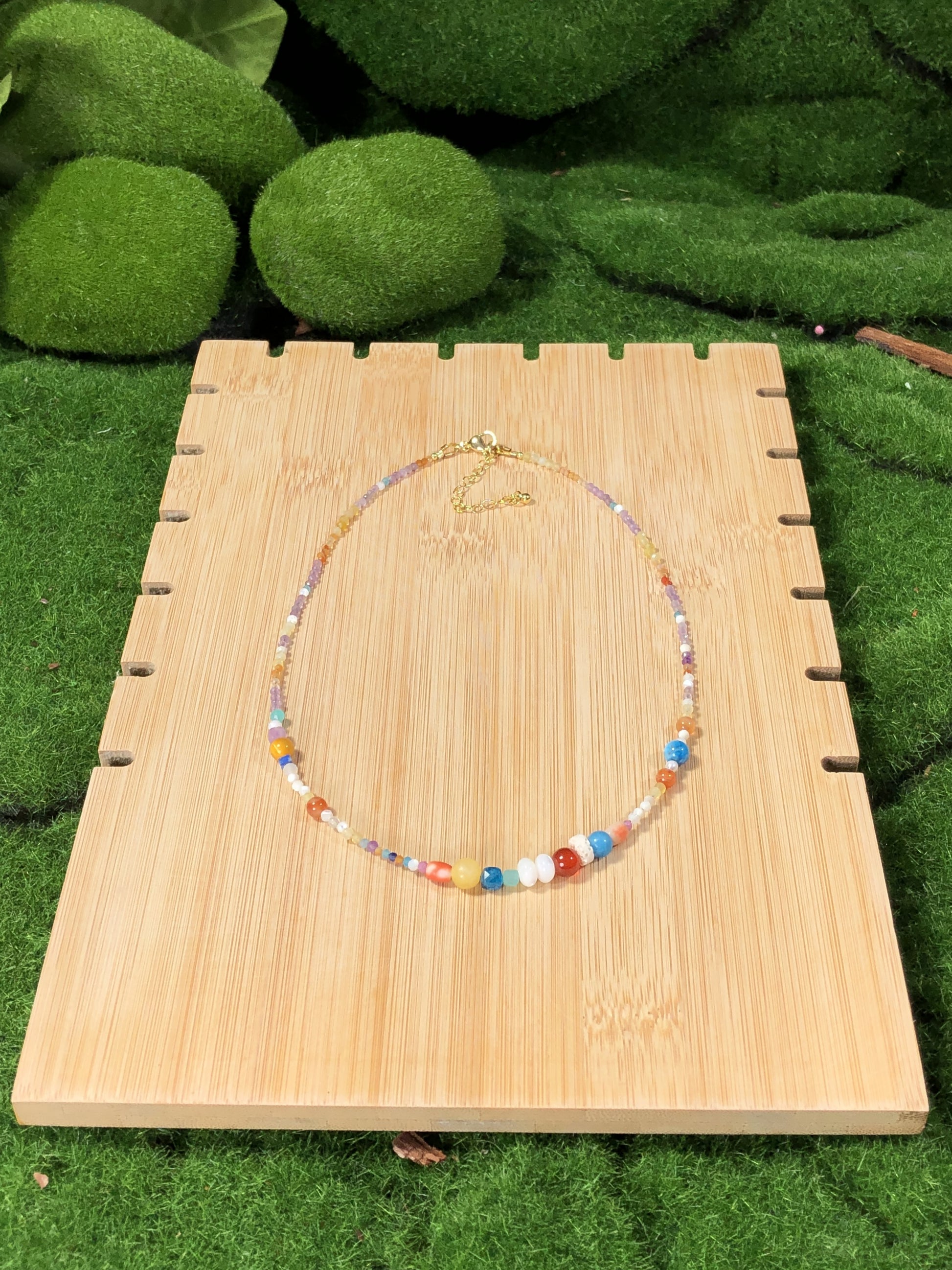 Eine handgefertigte Halskette mit Kristall, Achat und anderen farbigen Edelsteinen.