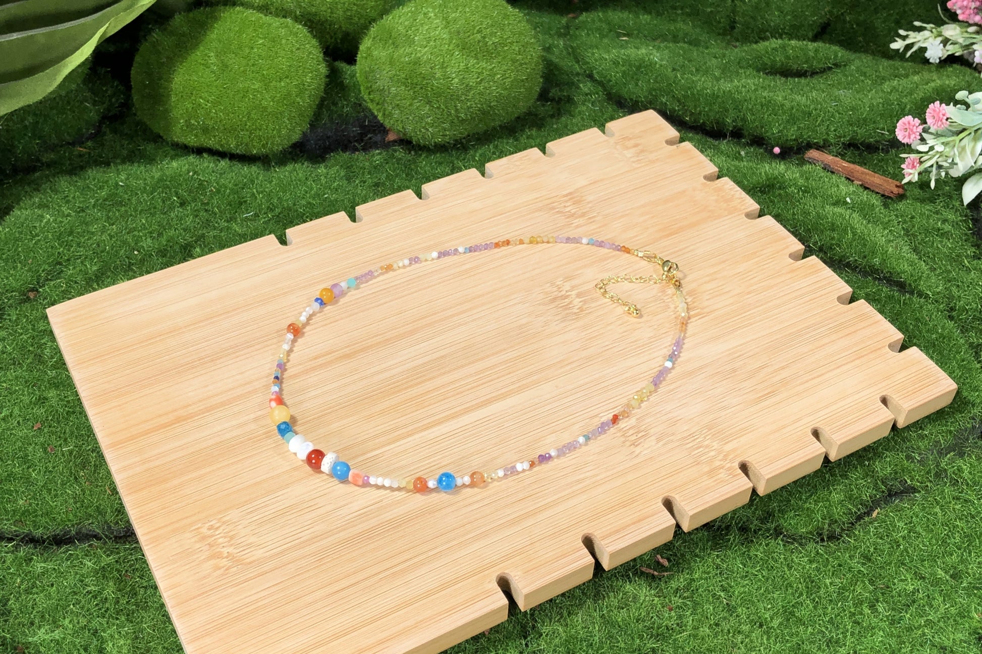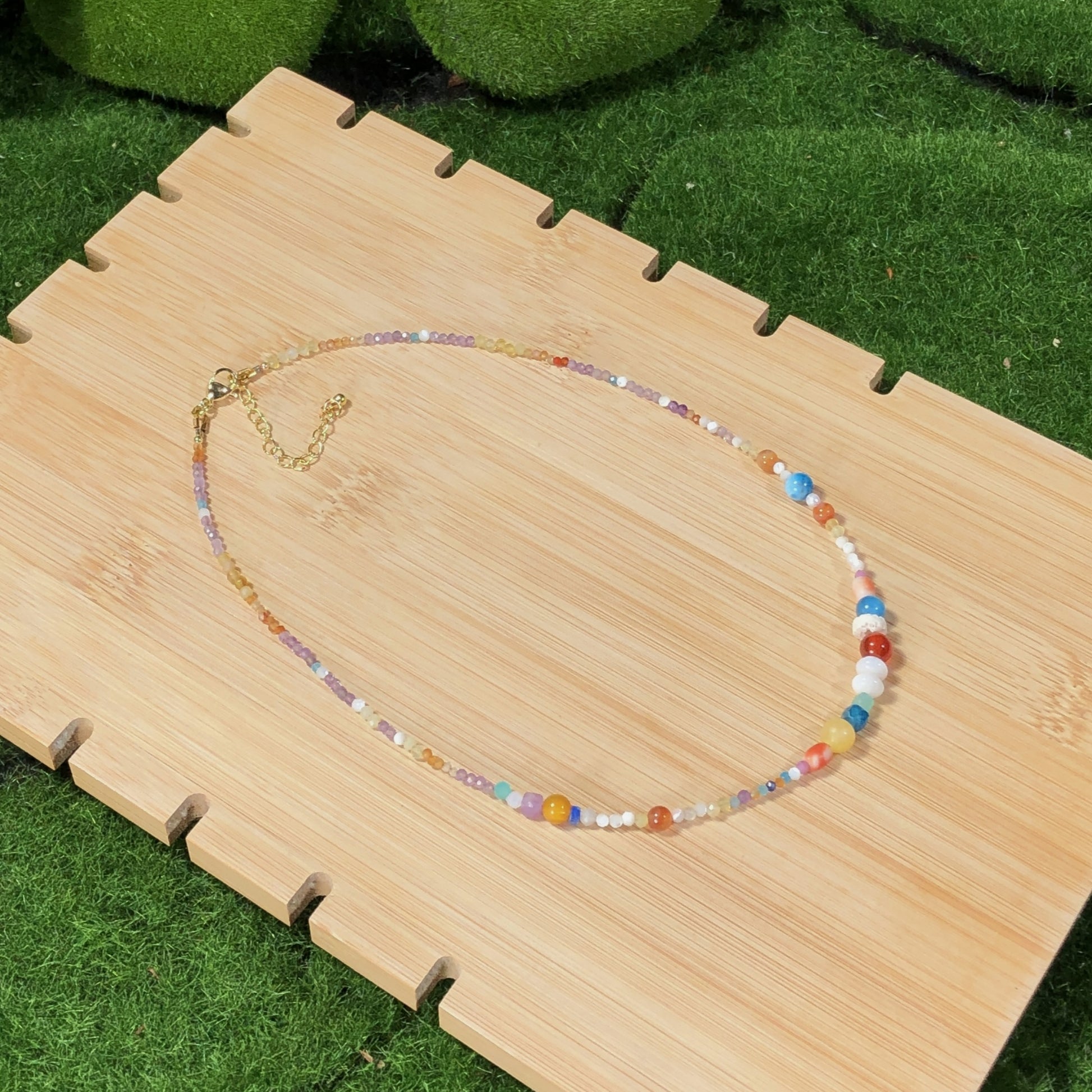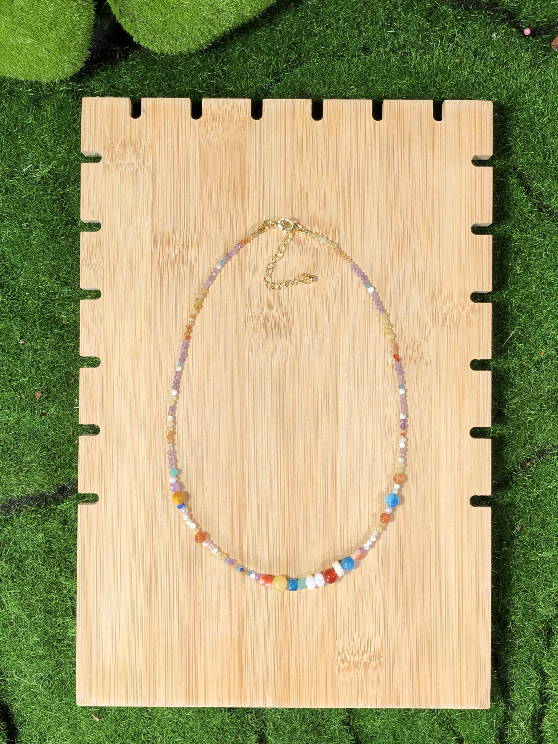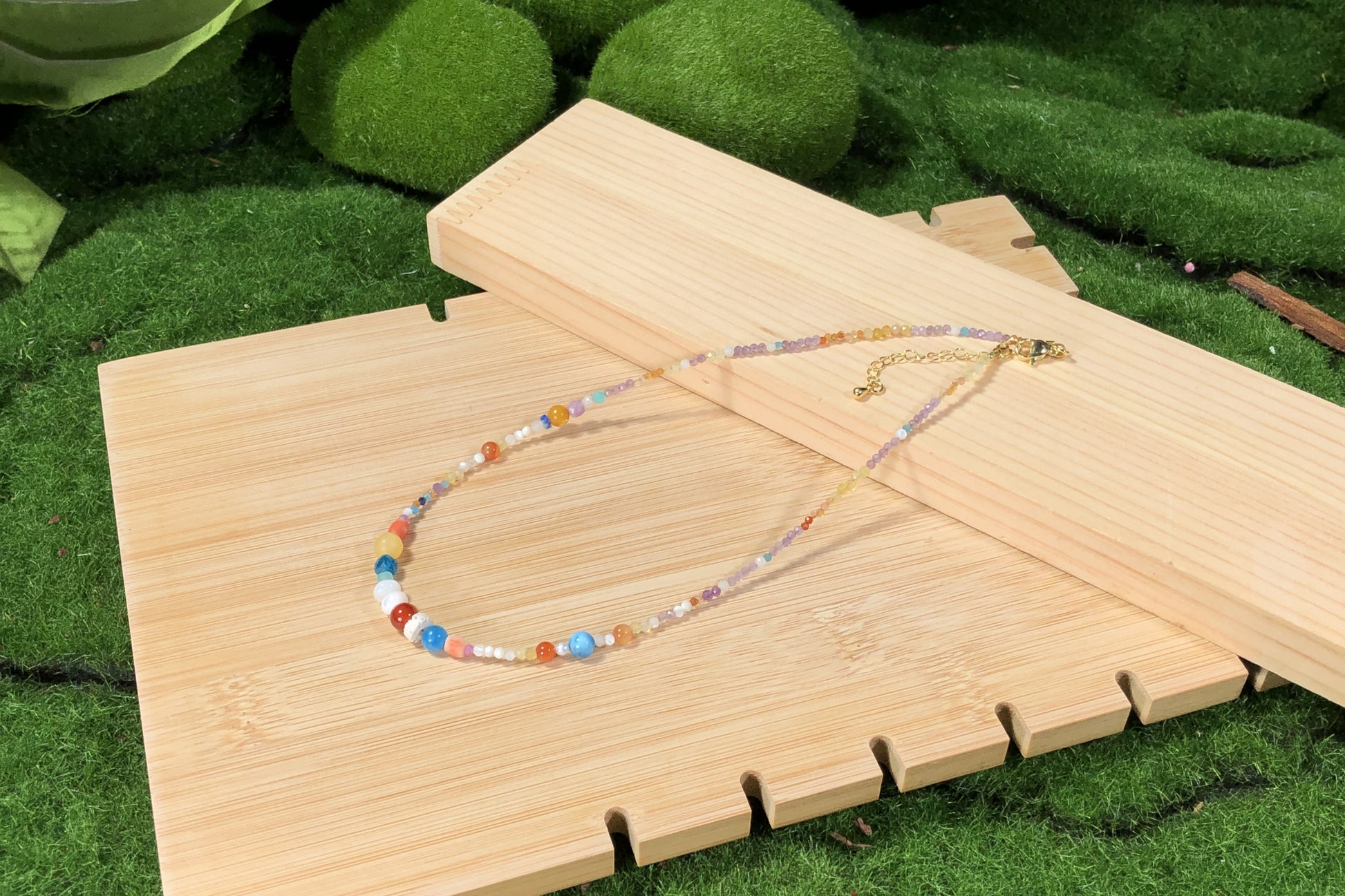 Eine handgefertigte Halskette mit Kristall, Achat und anderen farbigen Edelsteinen.