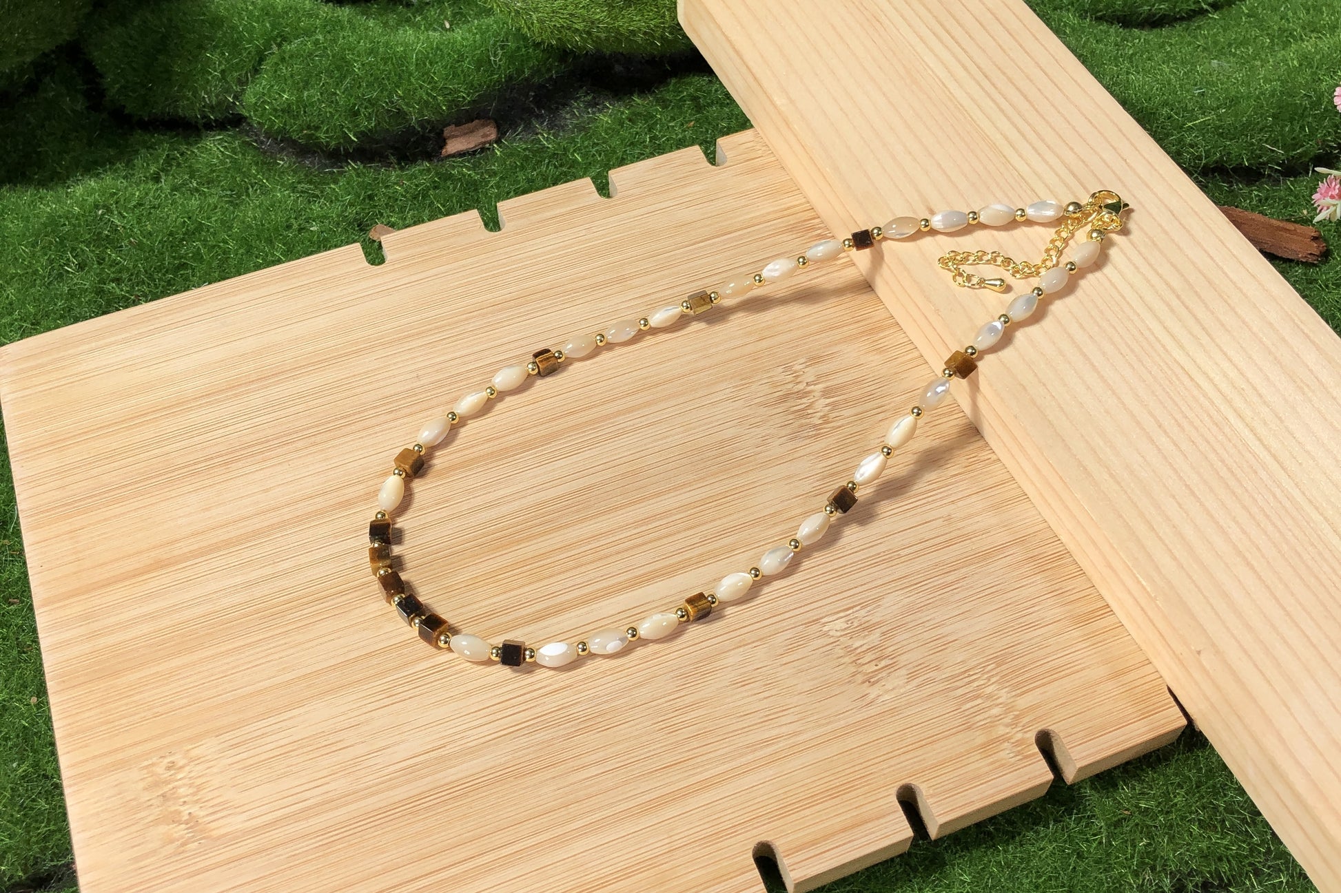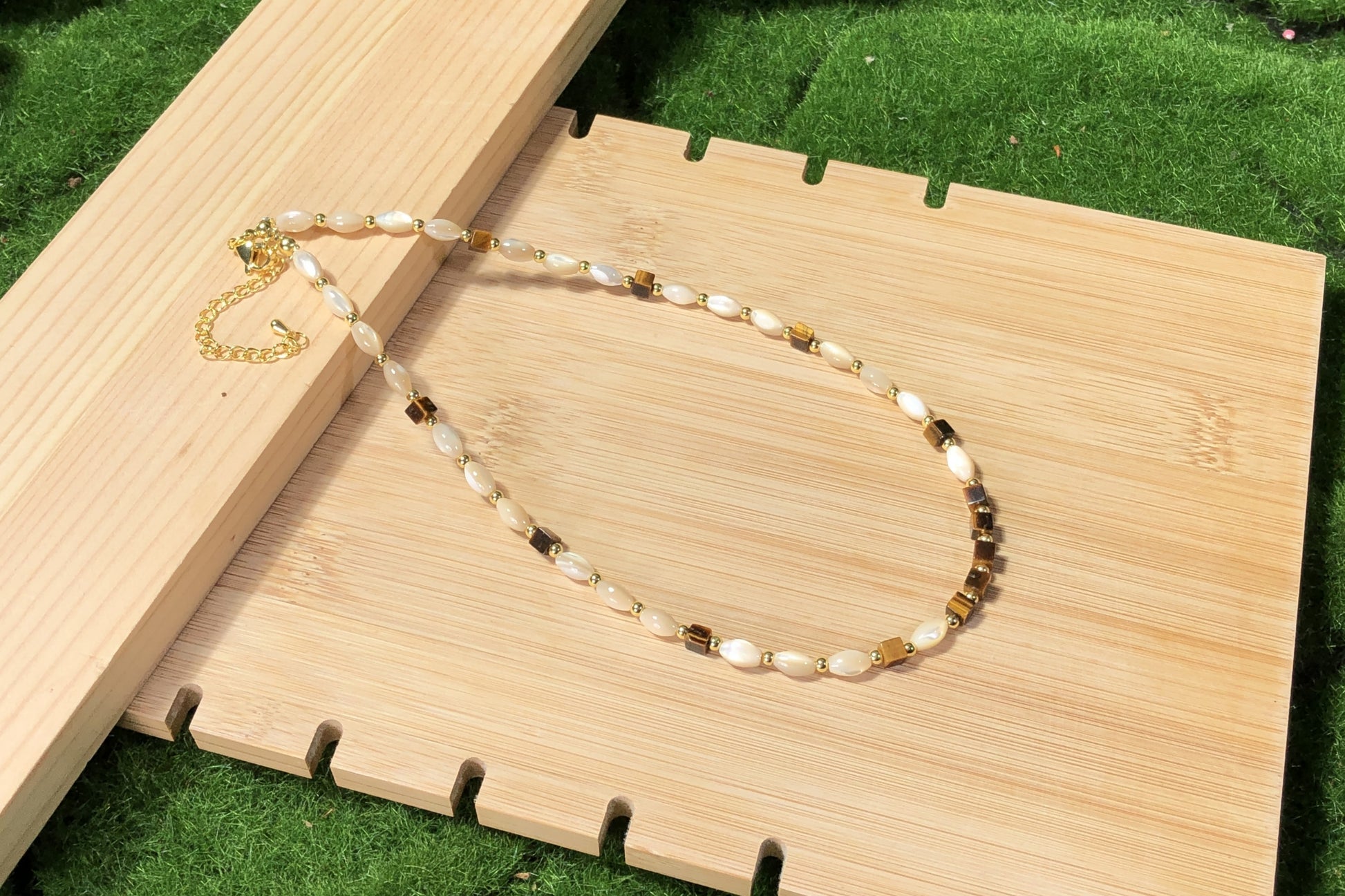 Eine handgefertigte Halskette mit Muschel- und natürlichen Tigeraugen-Würfelperlen und einer 14-karätig verkupferten Goldkette.