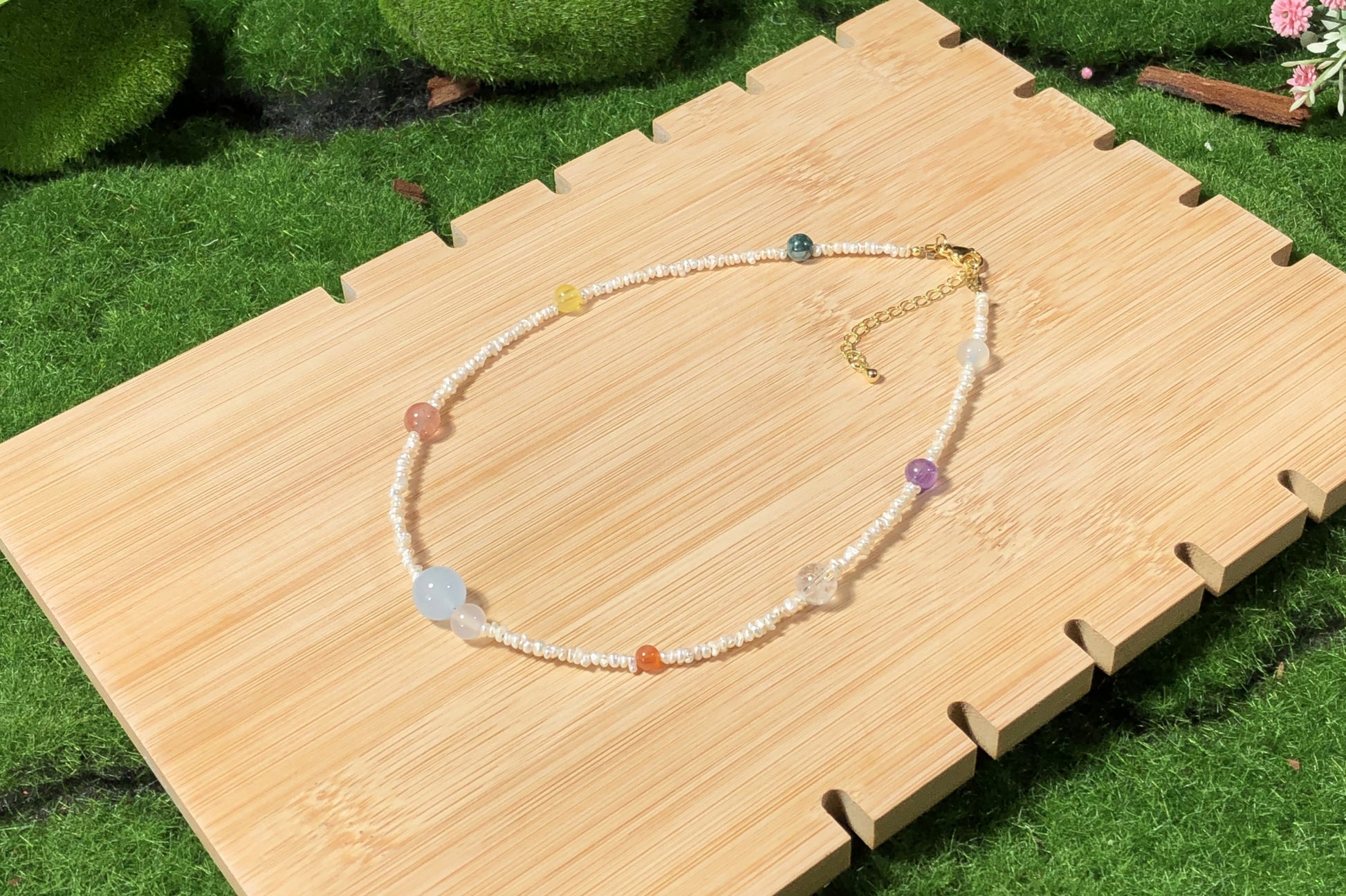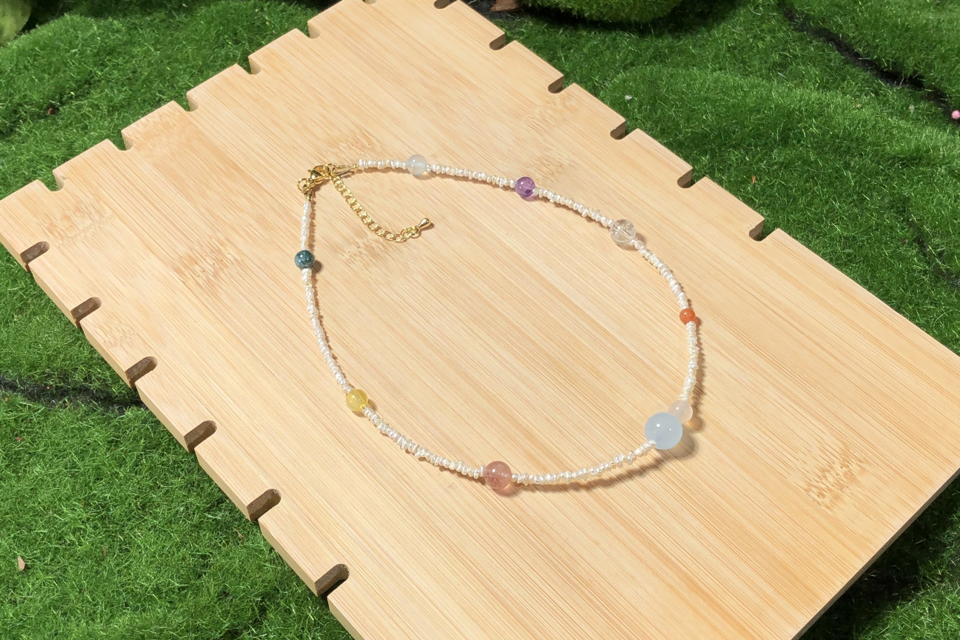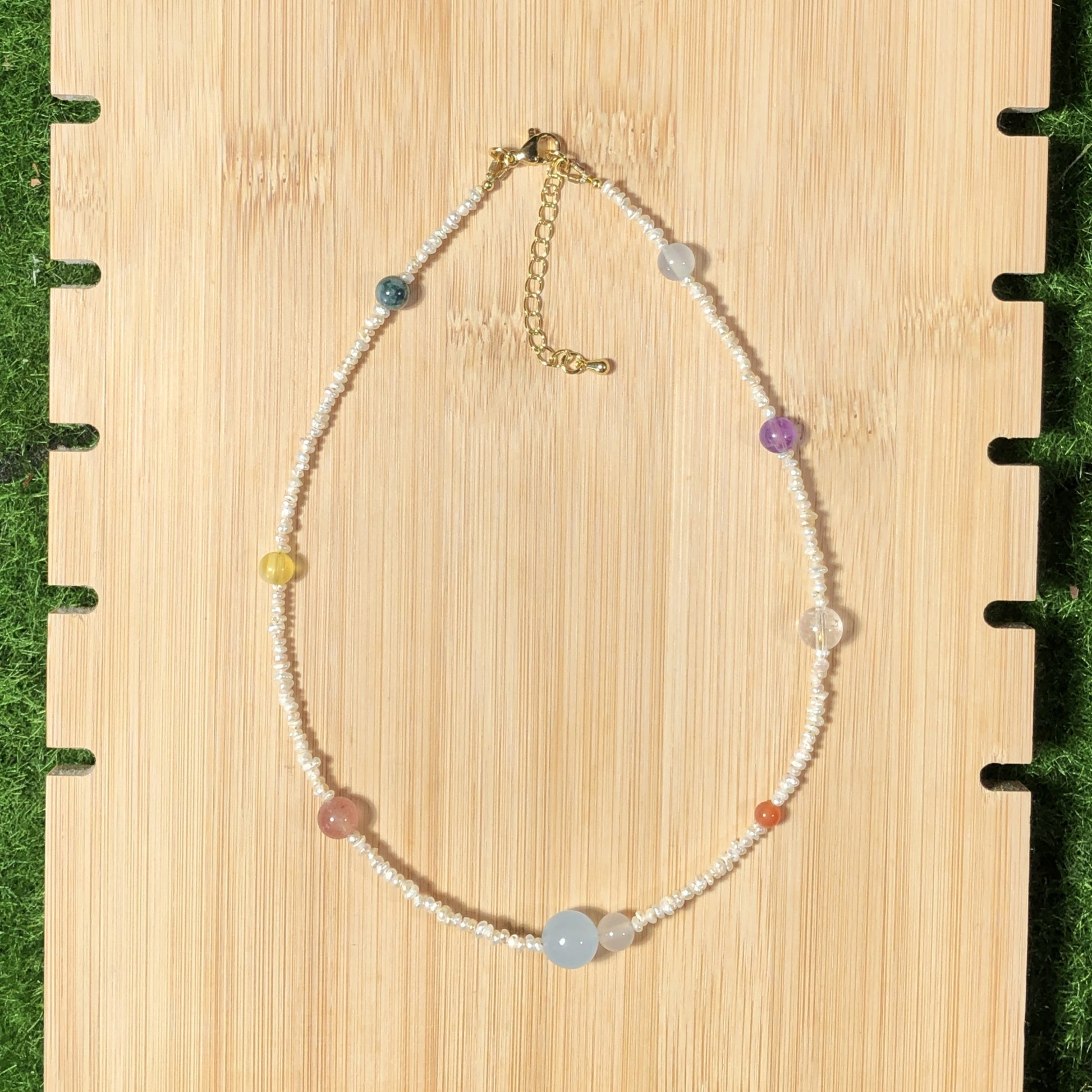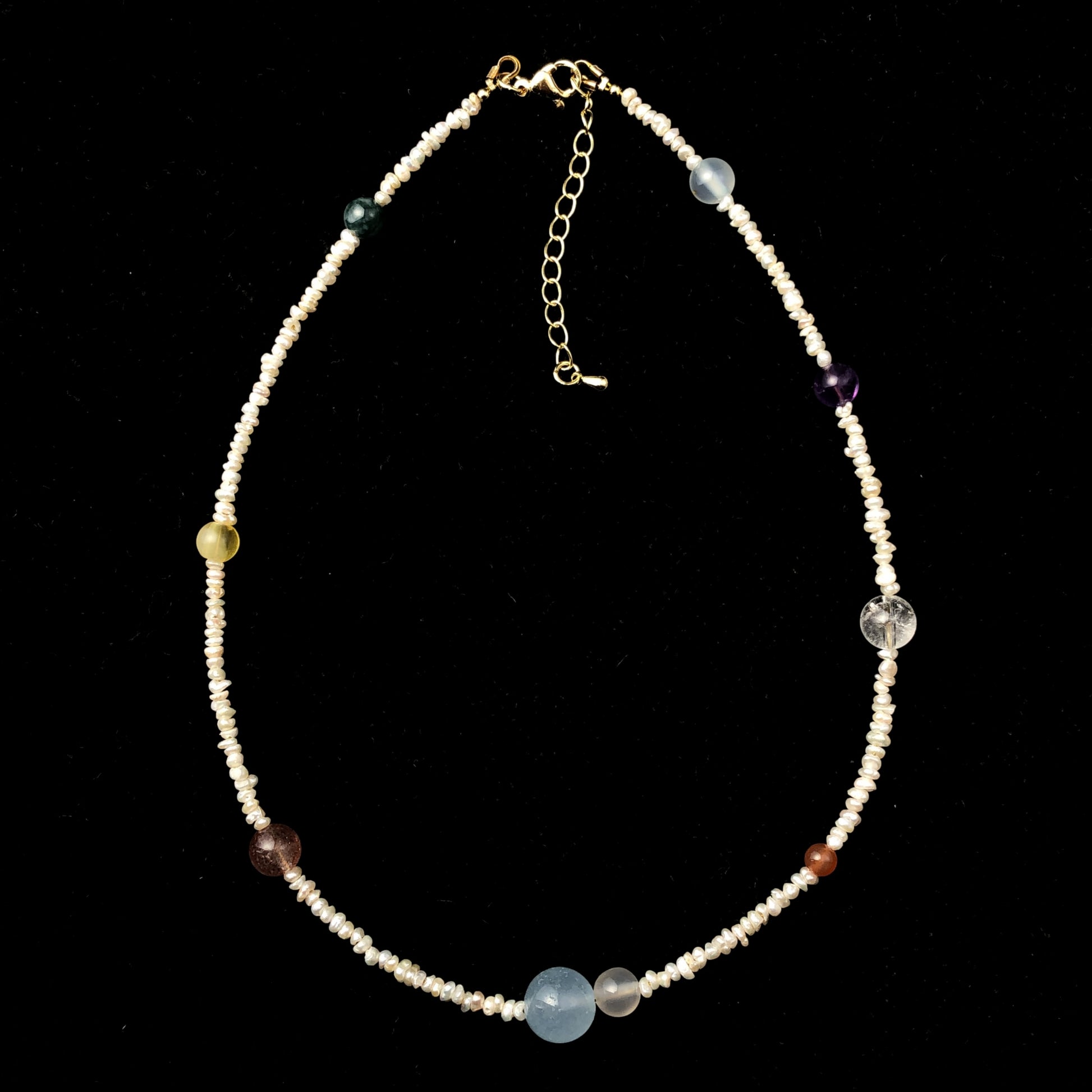 Eine handgefertigte Halskette mit natürlichen Süßwasserperlen und farbigen Edelsteinen, die die acht Planeten darstellen.
