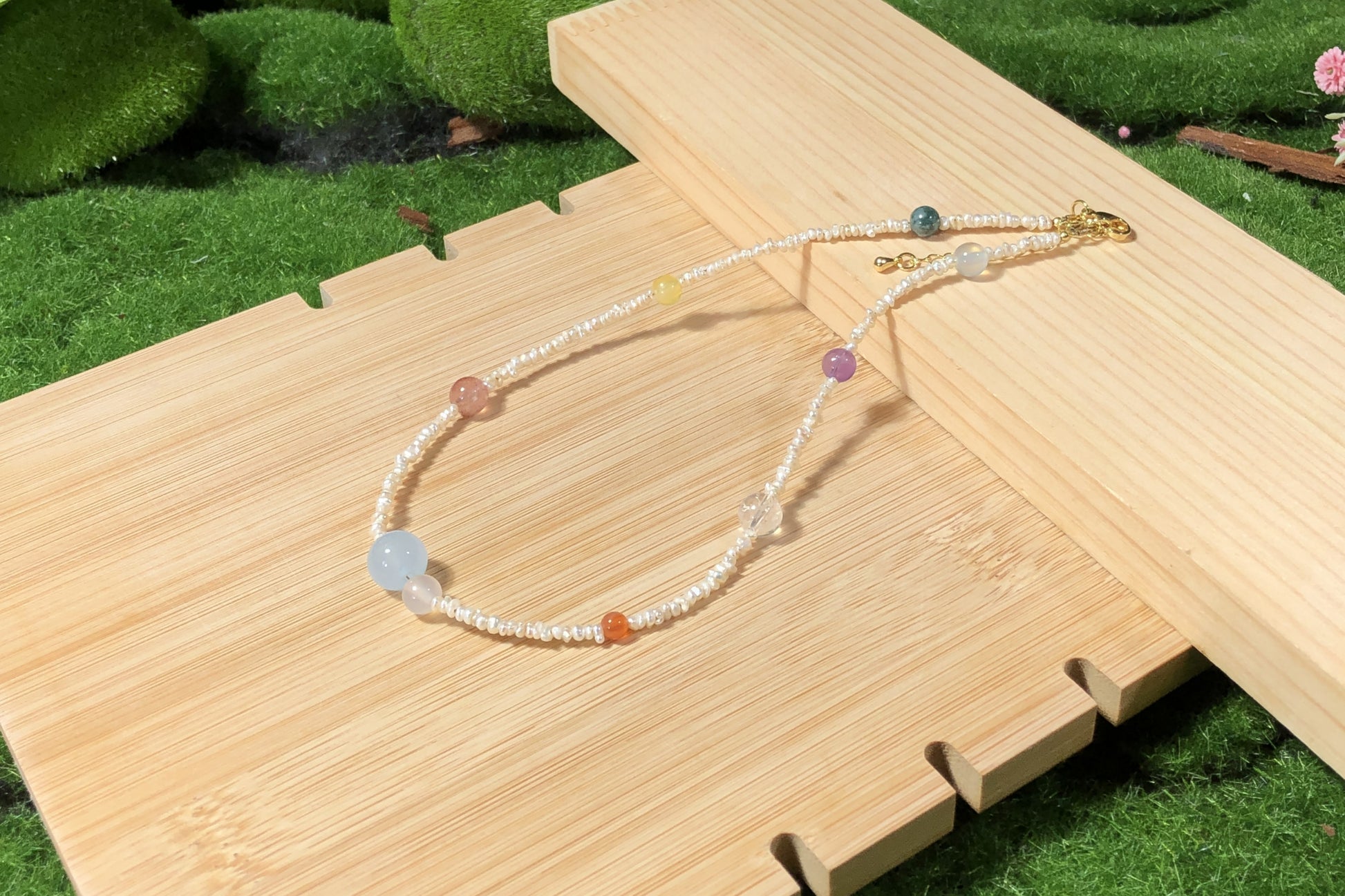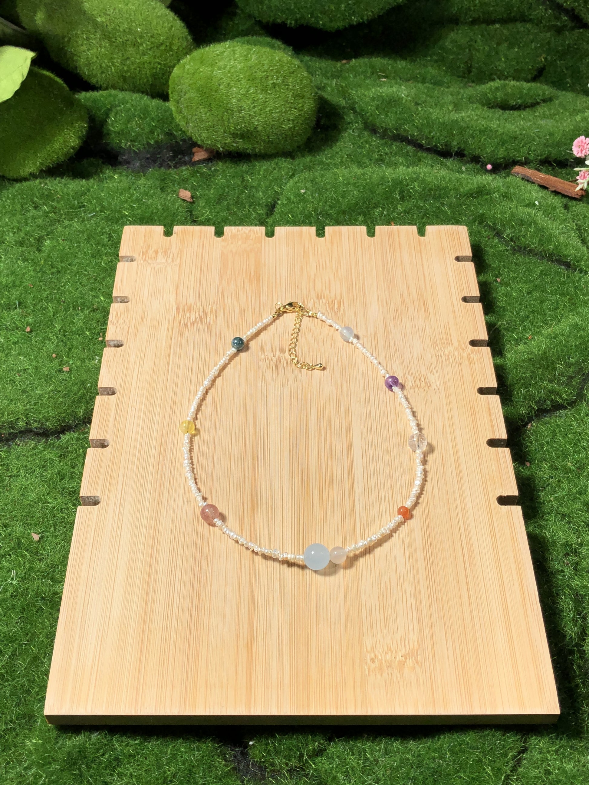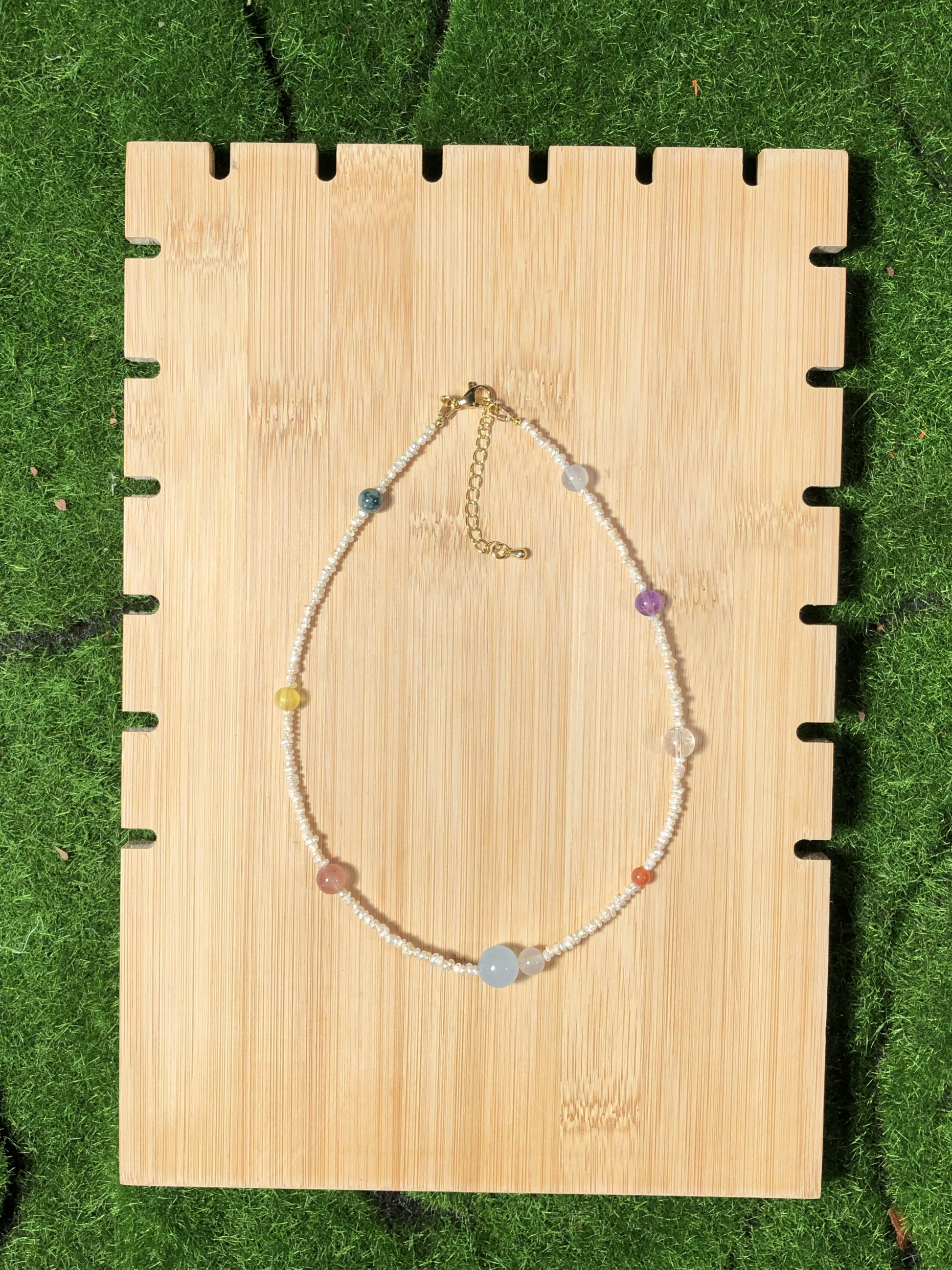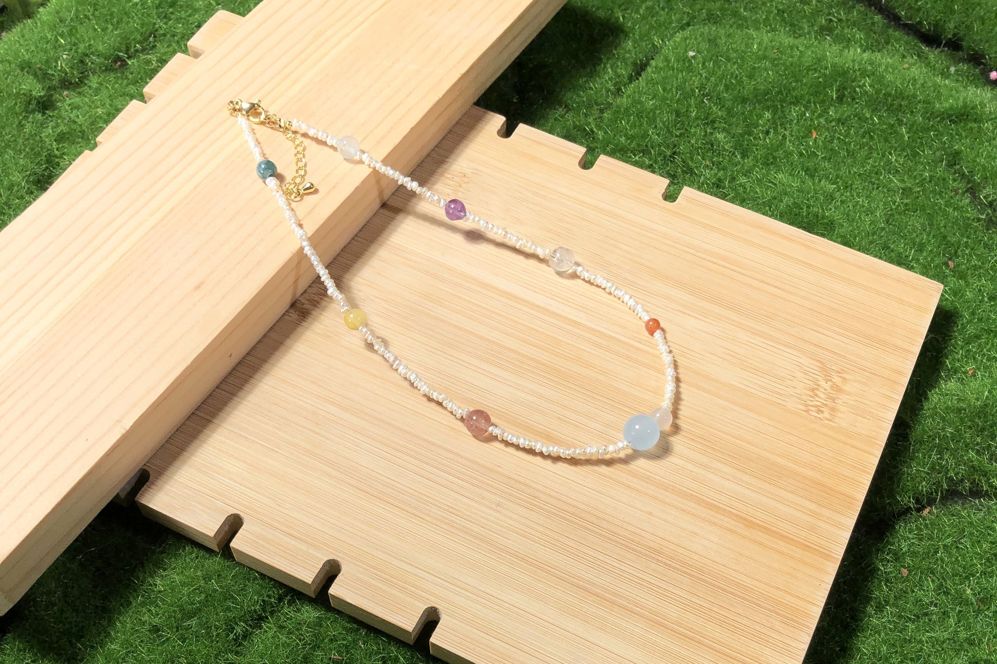 Eine handgefertigte Halskette mit natürlichen Süßwasserperlen und farbigen Edelsteinen, die die acht Planeten darstellen.