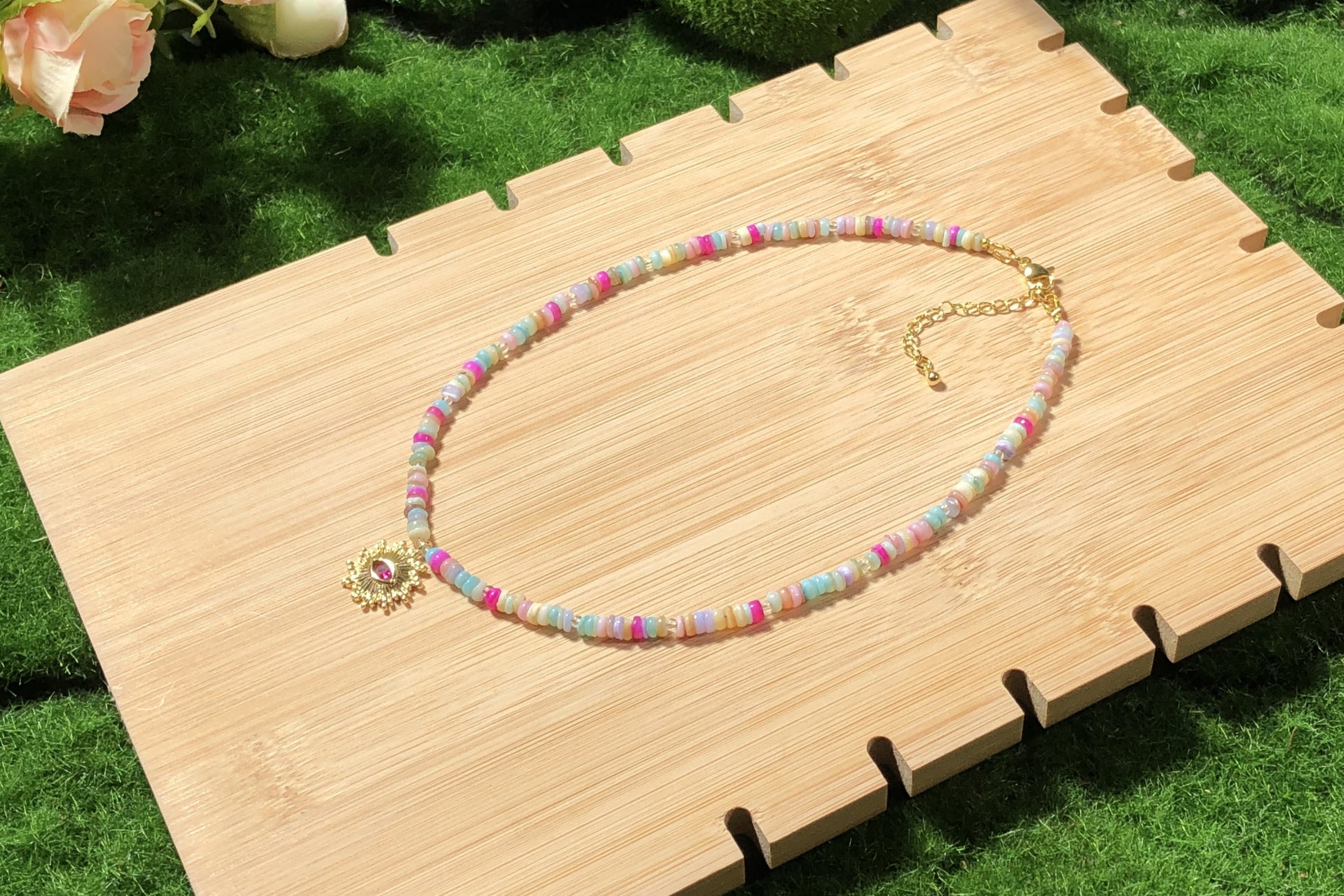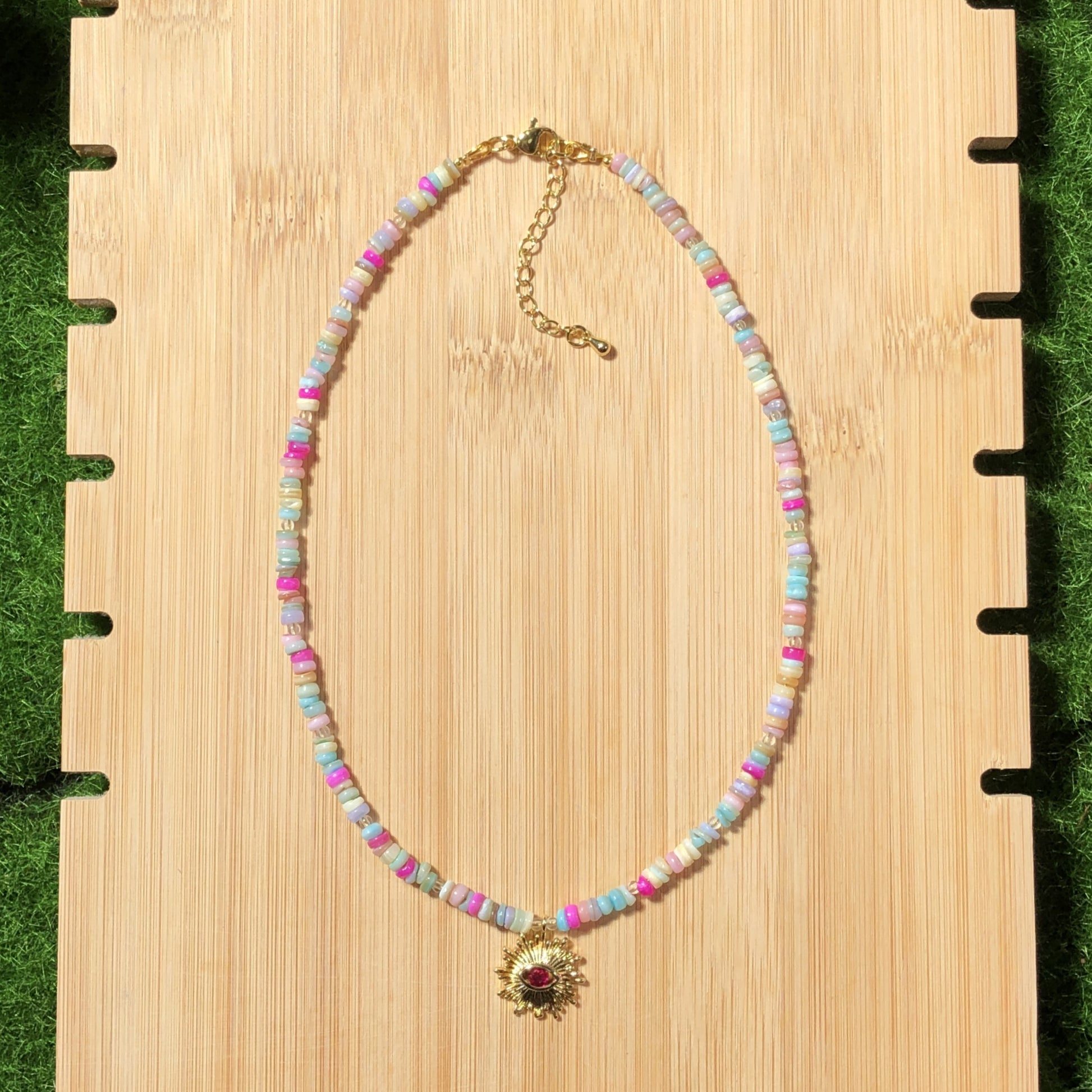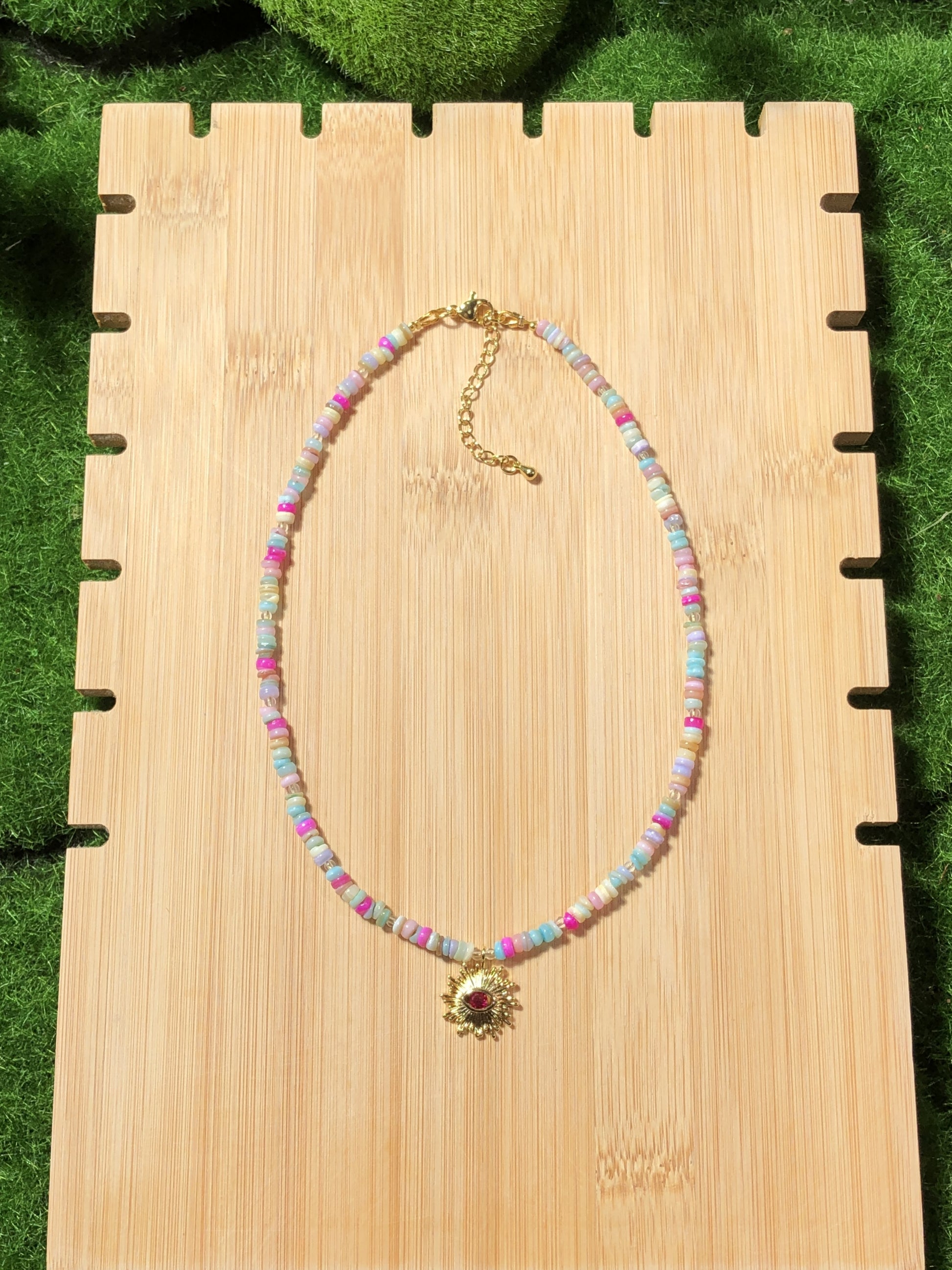 Farbenfrohe Muschelkette mit einem 14-karätig vergoldeten Kupferanhänger, handgefertigt.