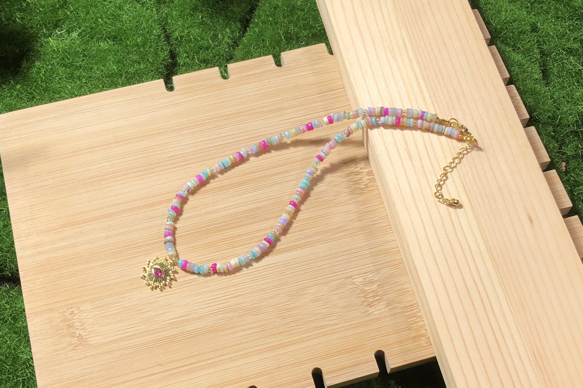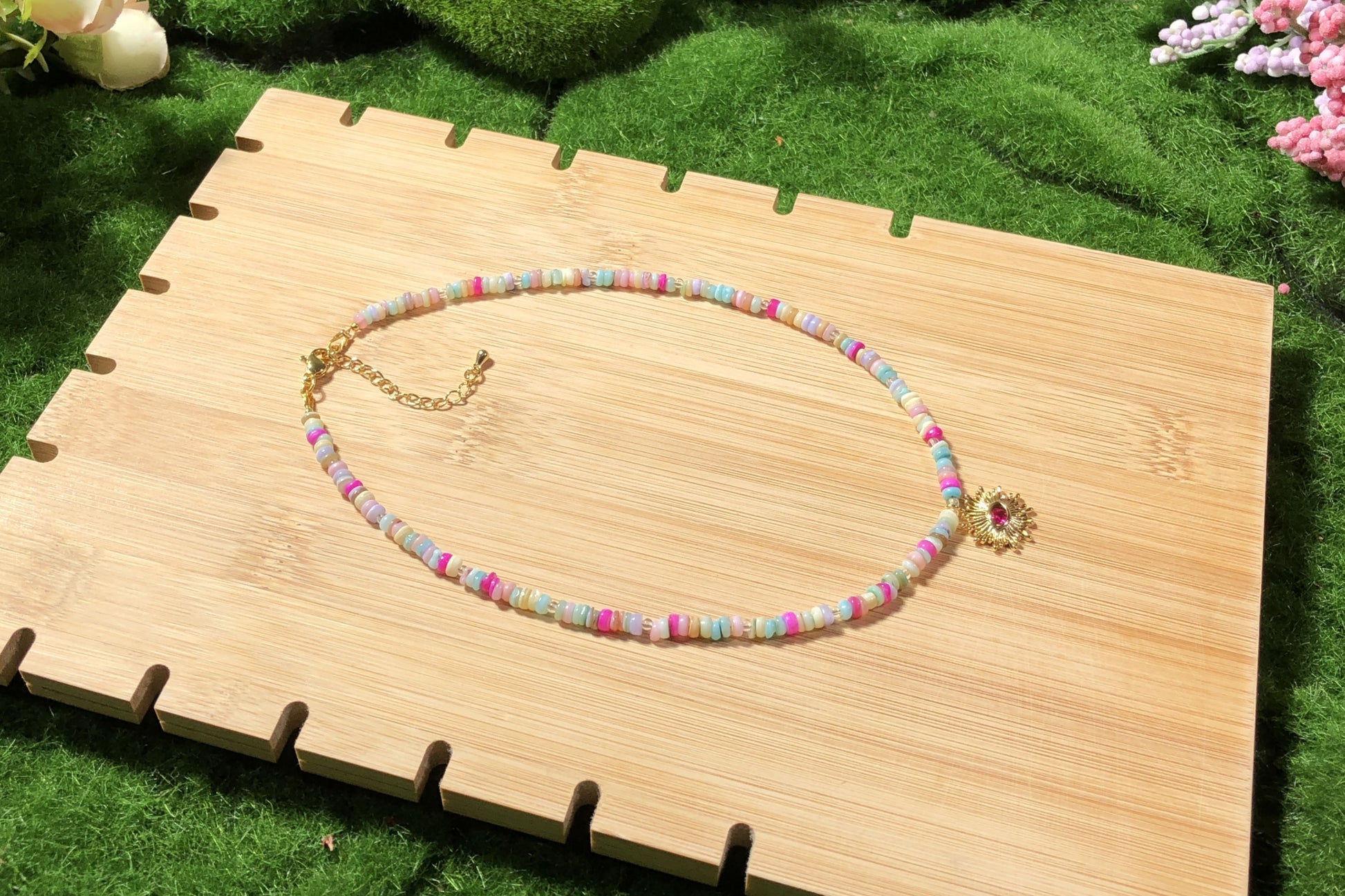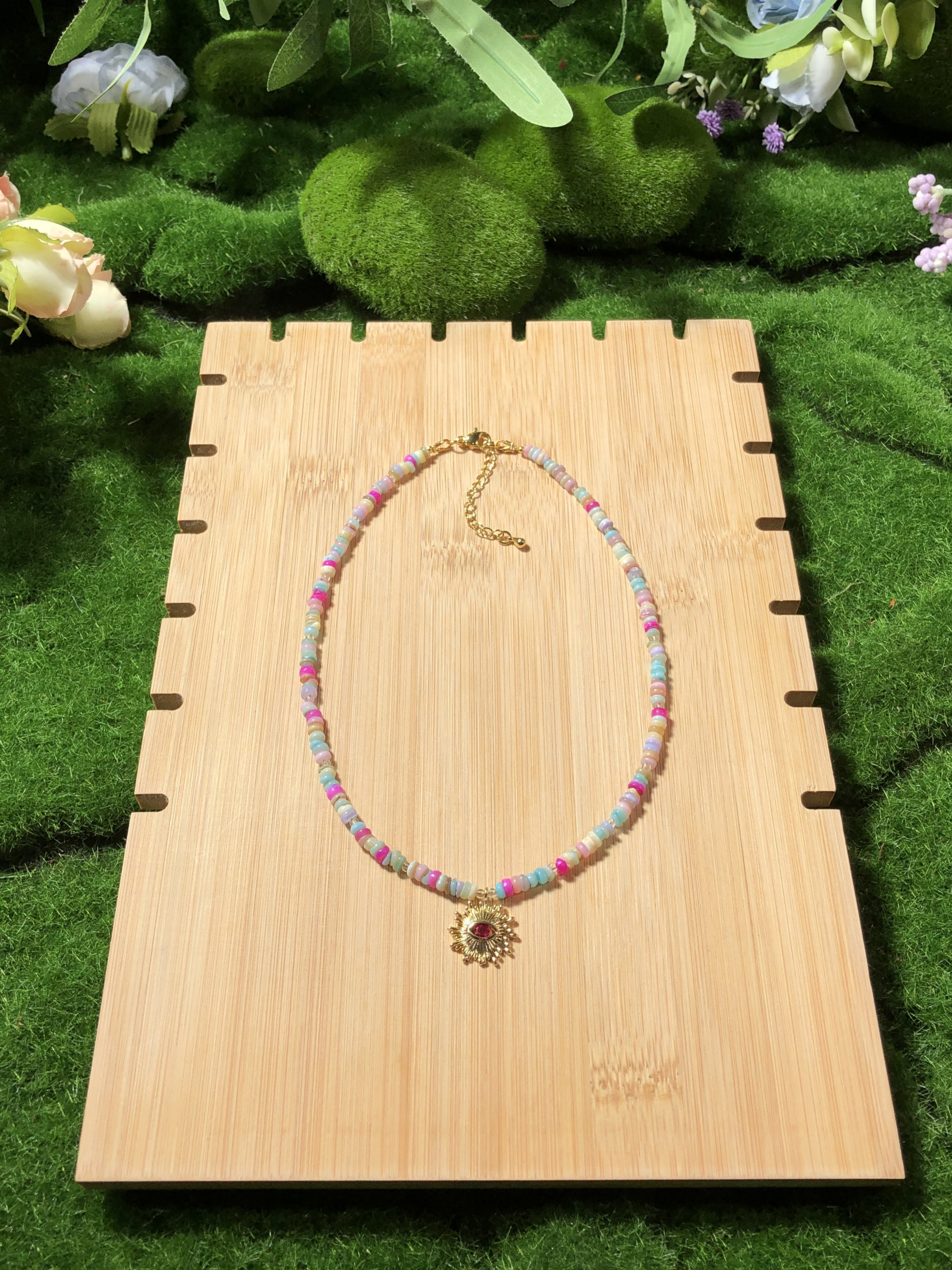 Farbenfrohe Muschelkette mit einem 14-karätig vergoldeten Kupferanhänger, handgefertigt.
