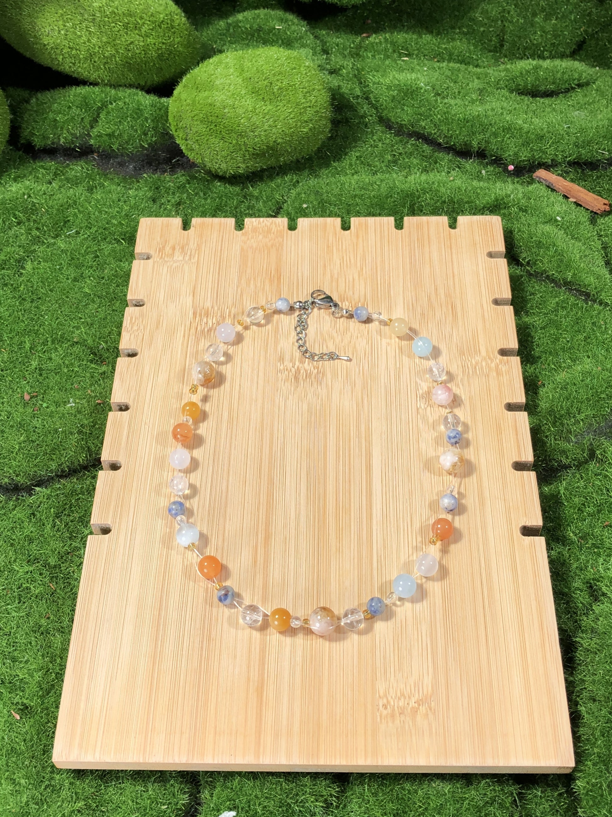 Farbige Edelsteinkette aus Kristall, Achat, Aquamarin und anderen Edelsteinen, handgefertigt.