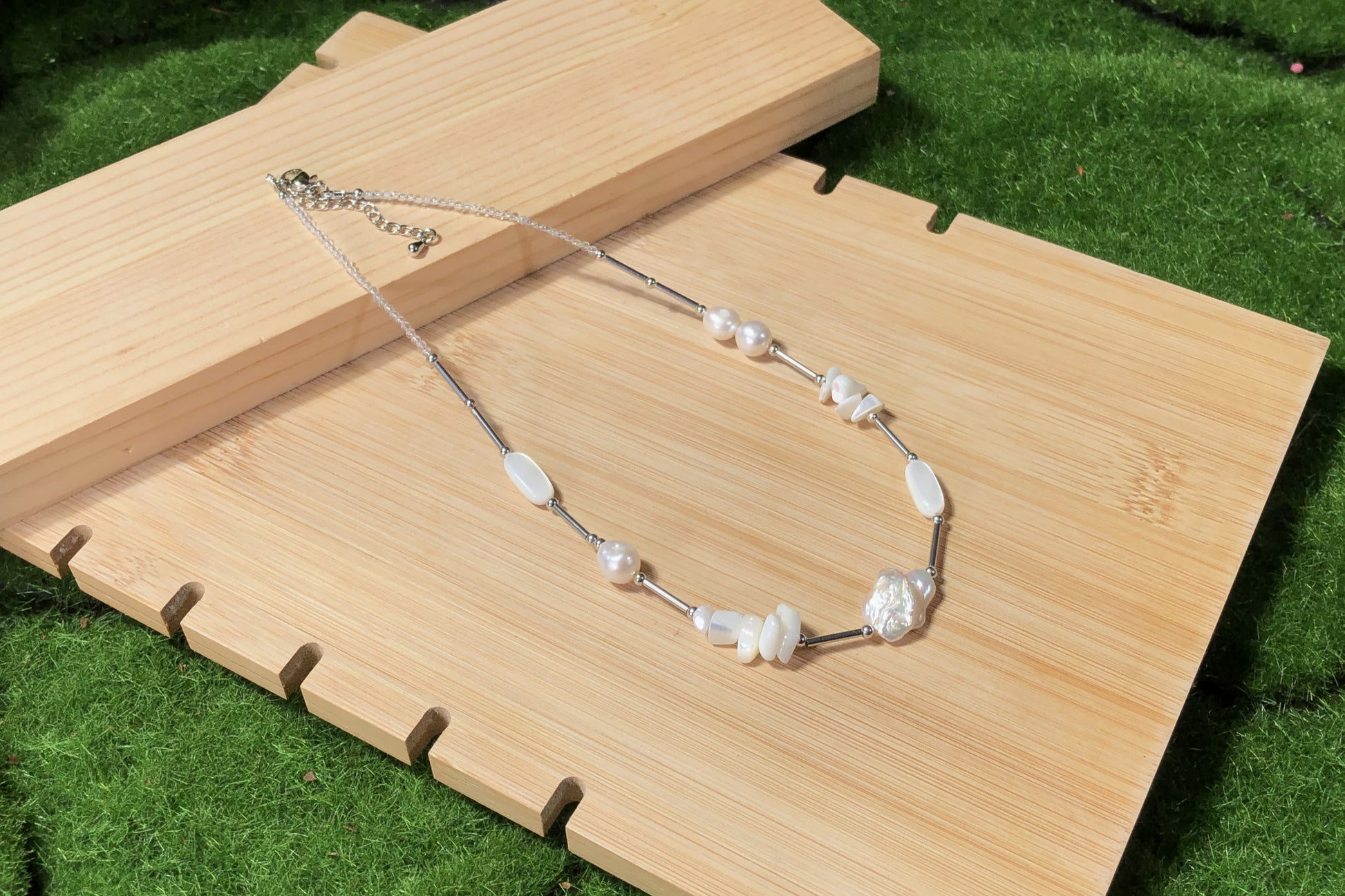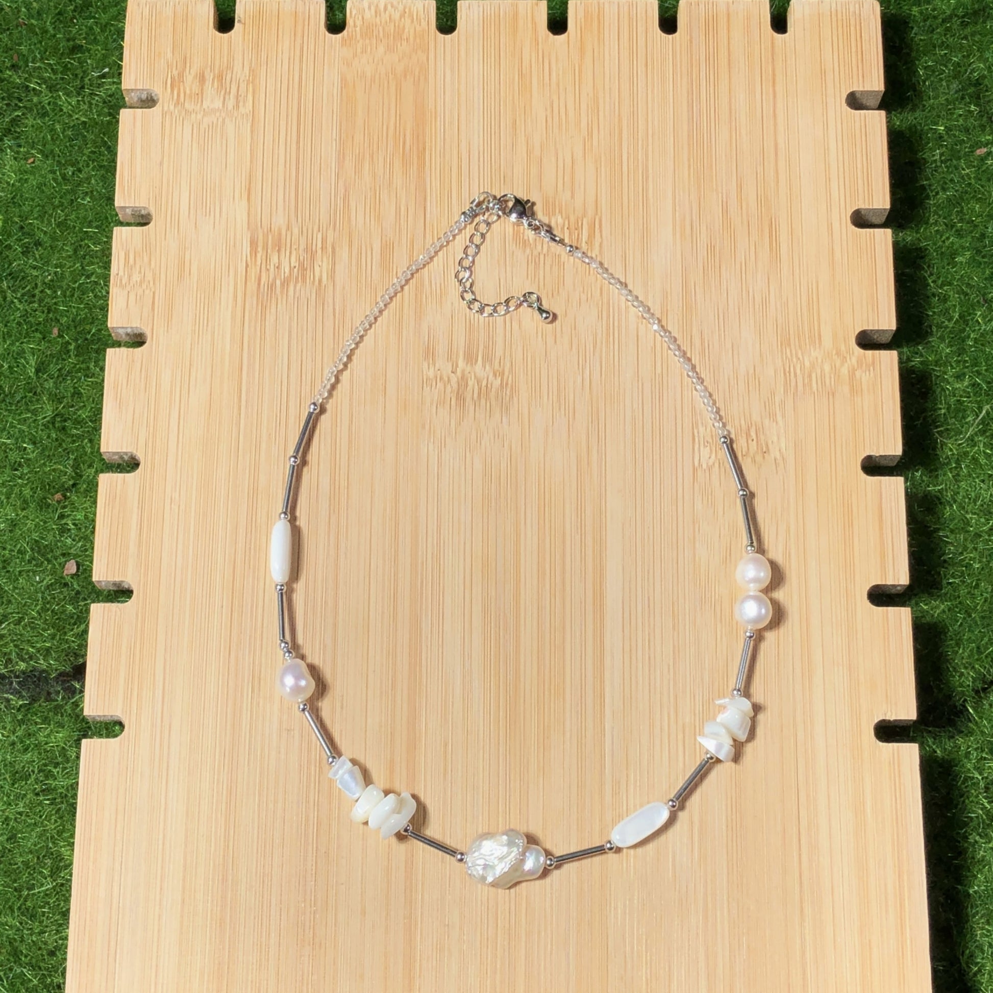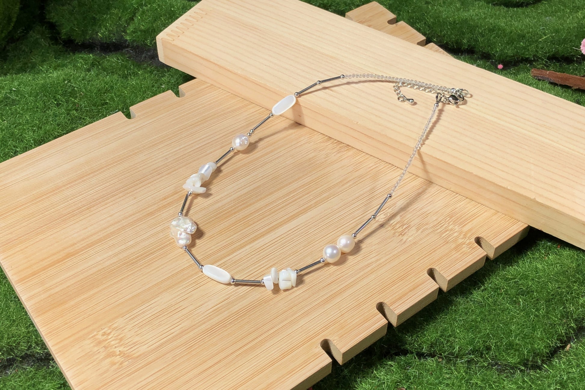 Halskette aus natürlichen Süßwasserperlen, Barockperlen und Muscheln, handgefertigt.