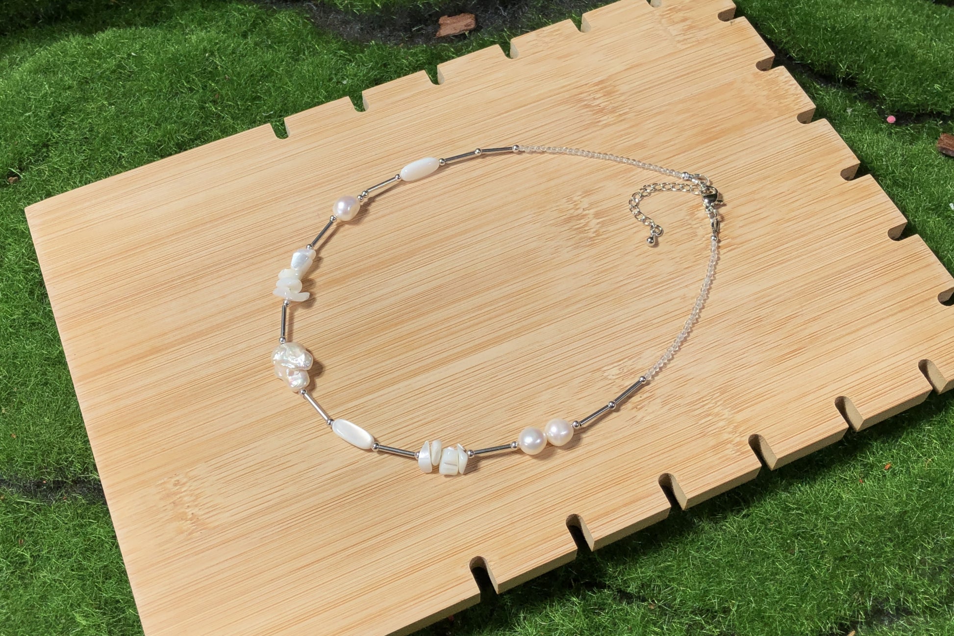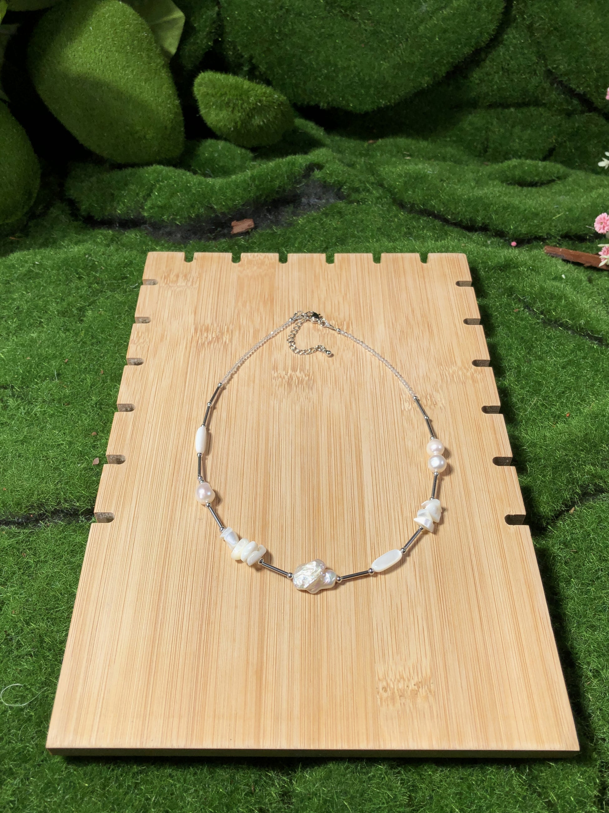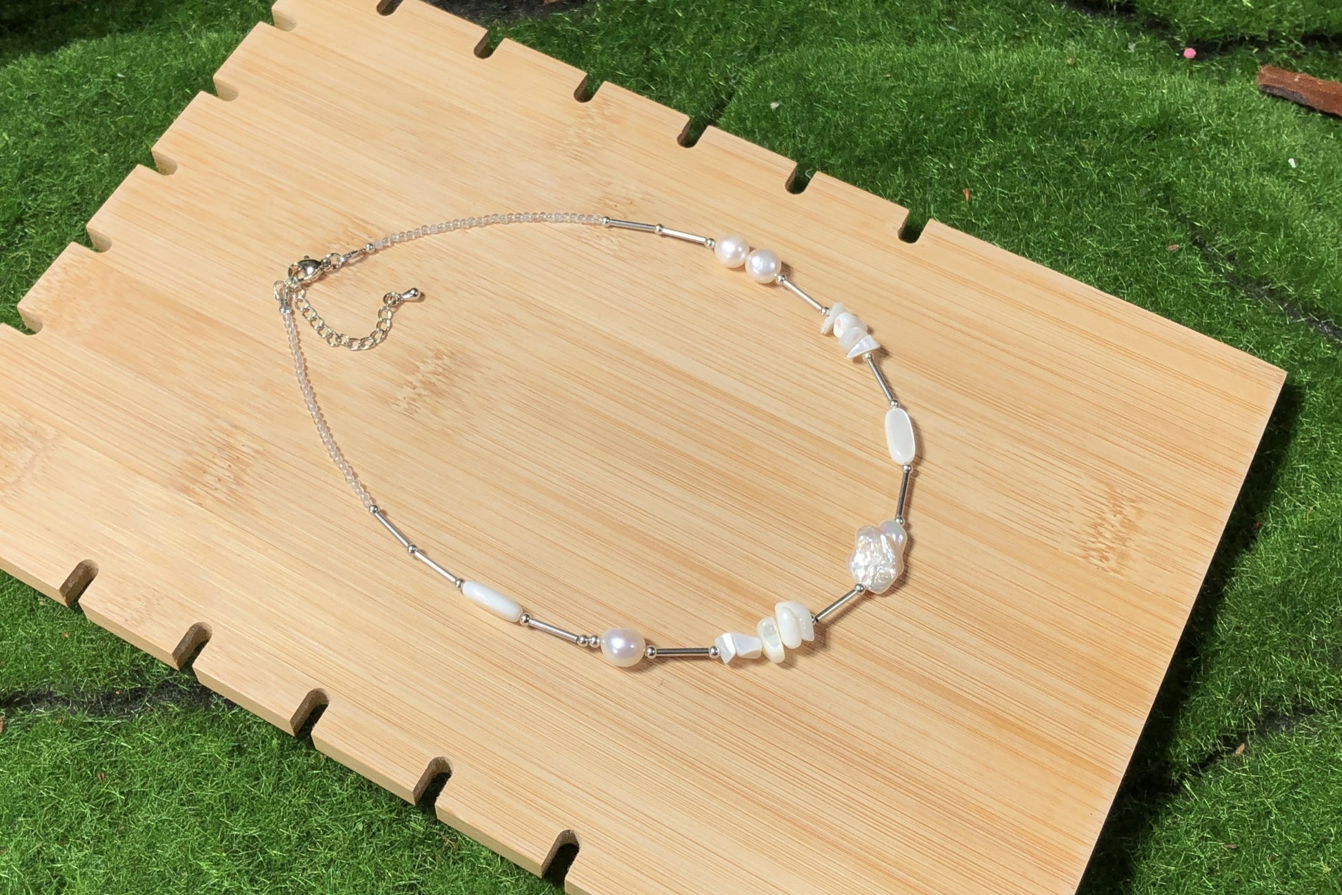 Halskette aus natürlichen Süßwasserperlen, Barockperlen und Muscheln, handgefertigt.