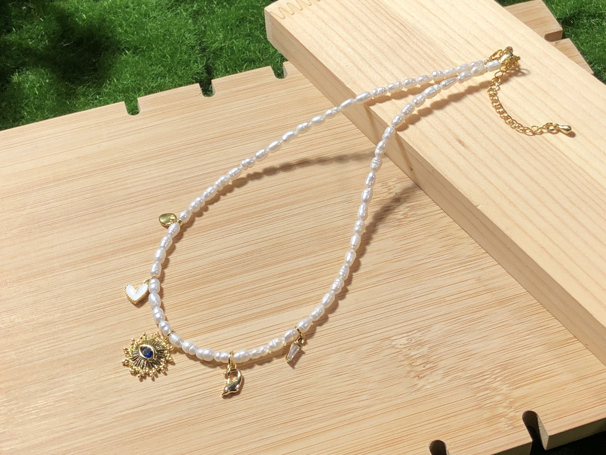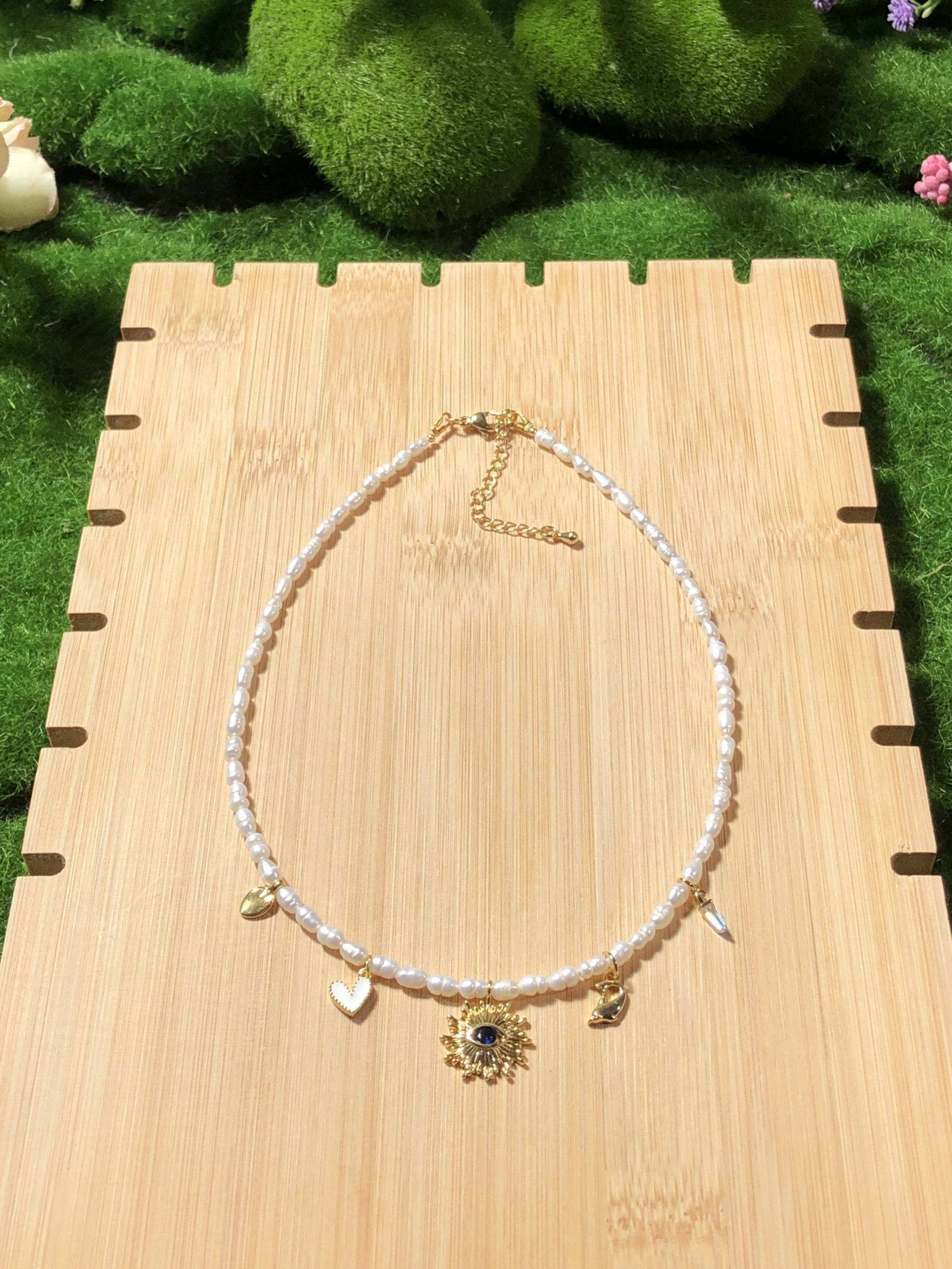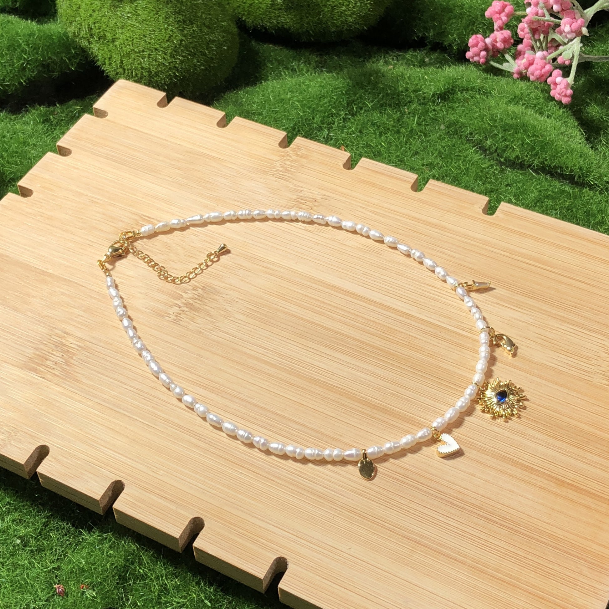 Halskette aus natürlichen Süßwasserperlen, kupferplattiert mit 14-karätigem Gold, Anhänger im Sonnen- und Teufelsaugen-Design, handgefertigt.
