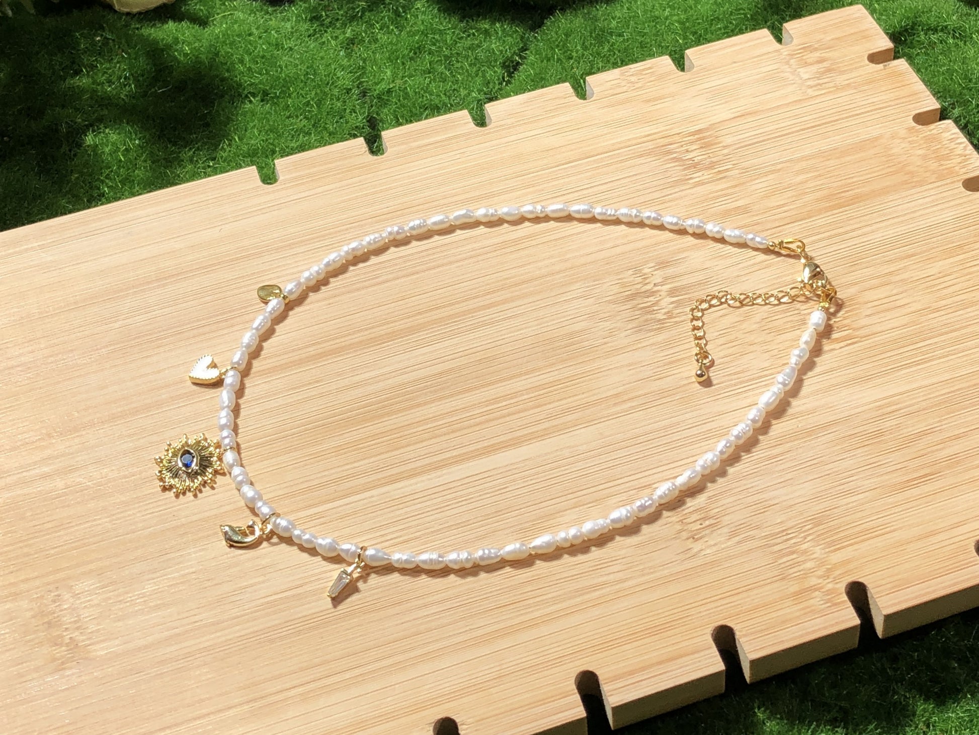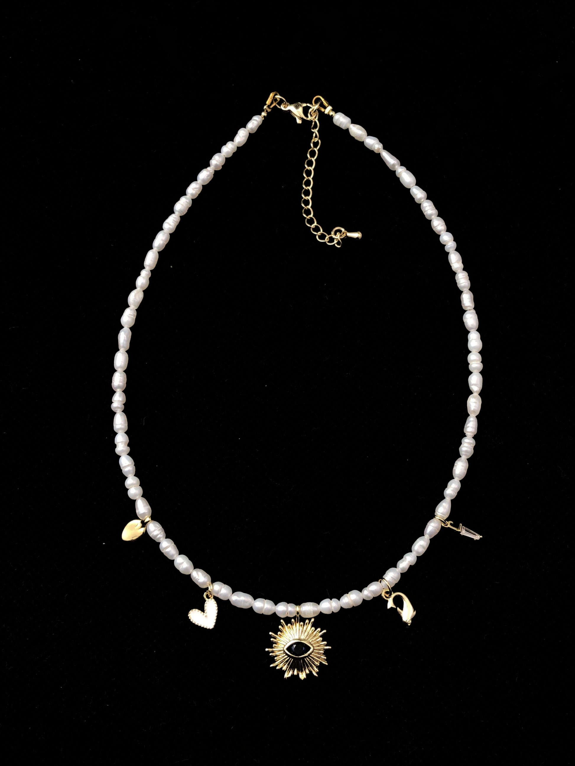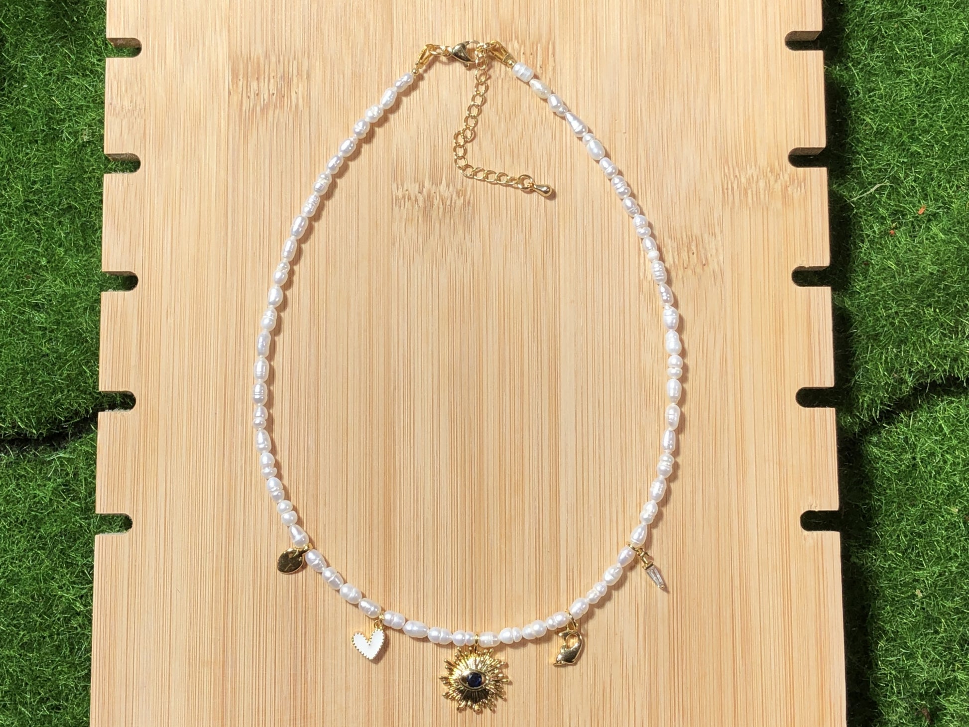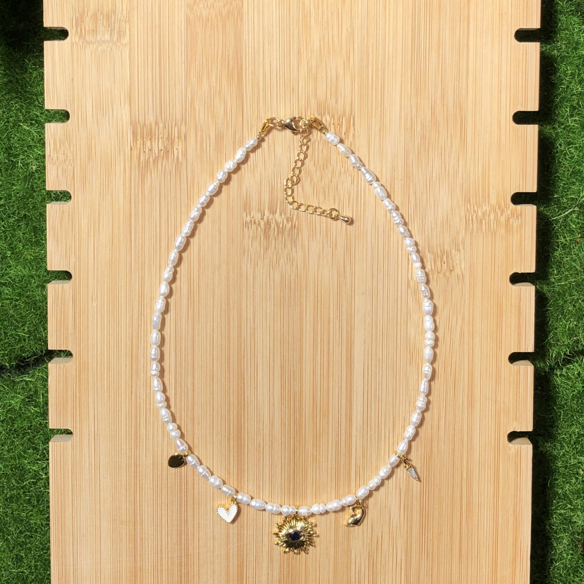 Halskette aus natürlichen Süßwasserperlen, kupferplattiert mit 14-karätigem Gold, Anhänger im Sonnen- und Teufelsaugen-Design, handgefertigt.