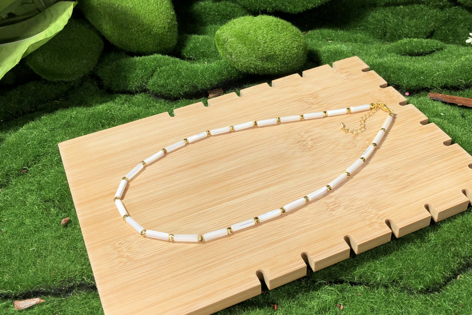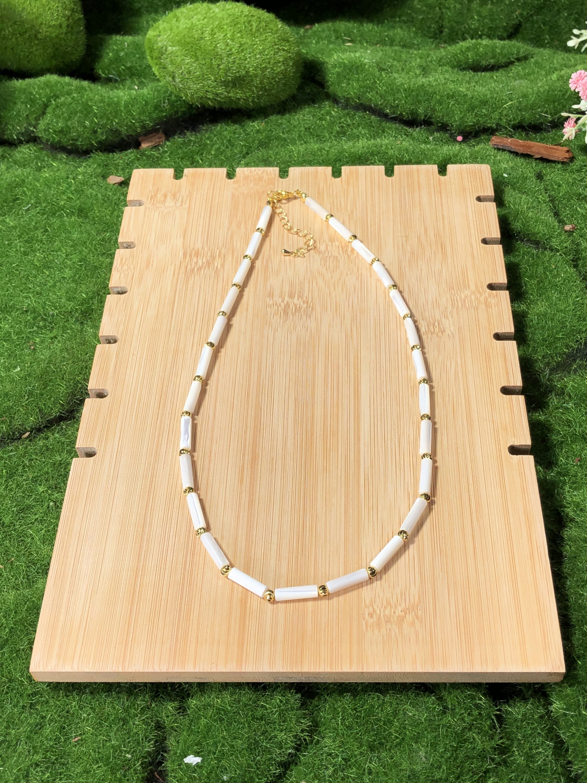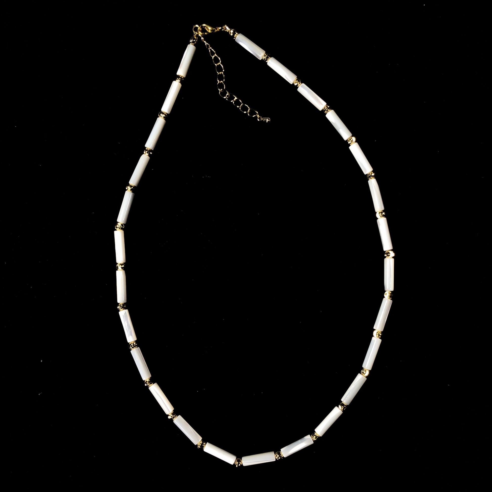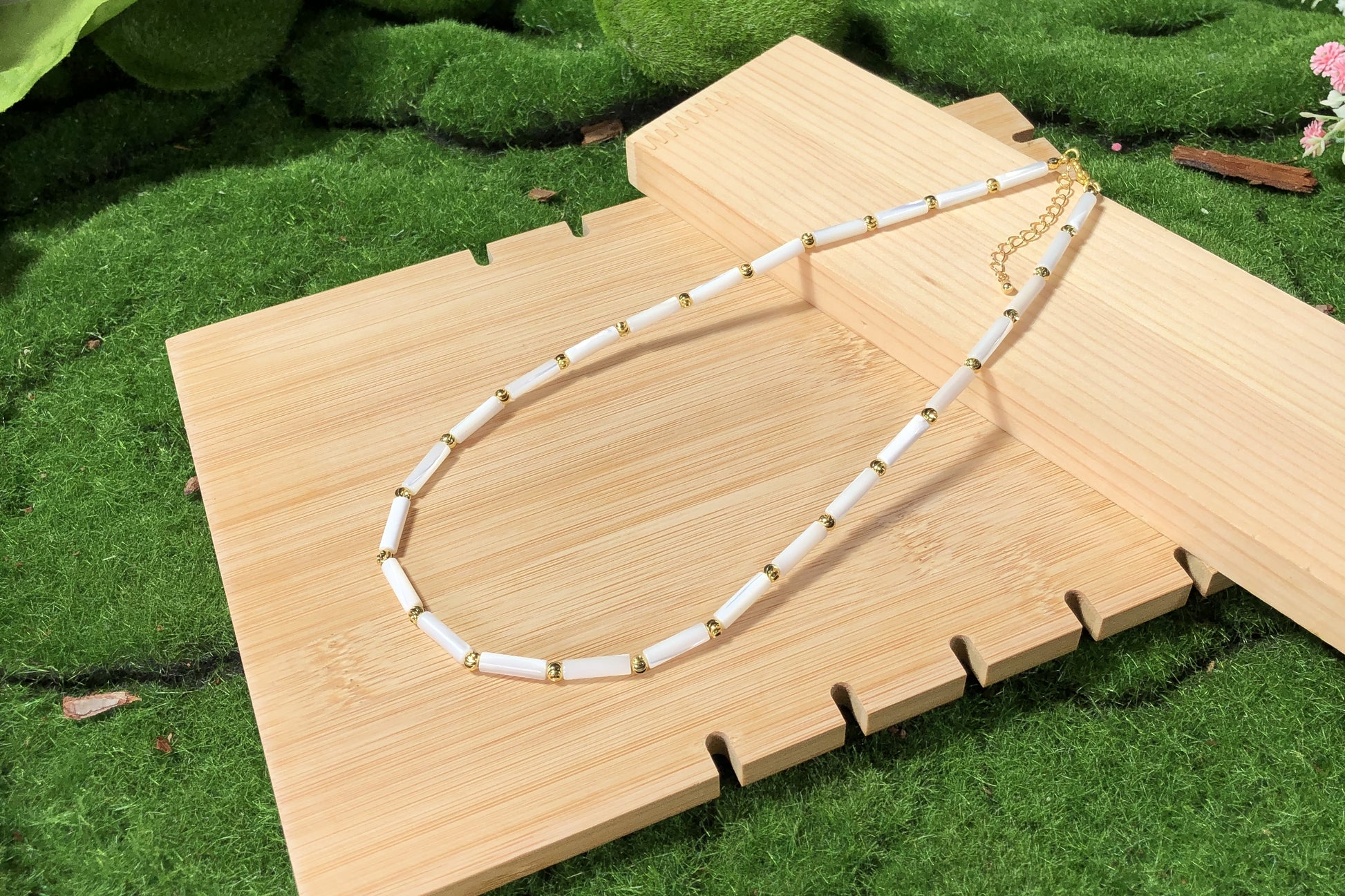 Halskette aus weißer Muschel, 14-karätig vergoldete Kupferkette, handgefertigt.