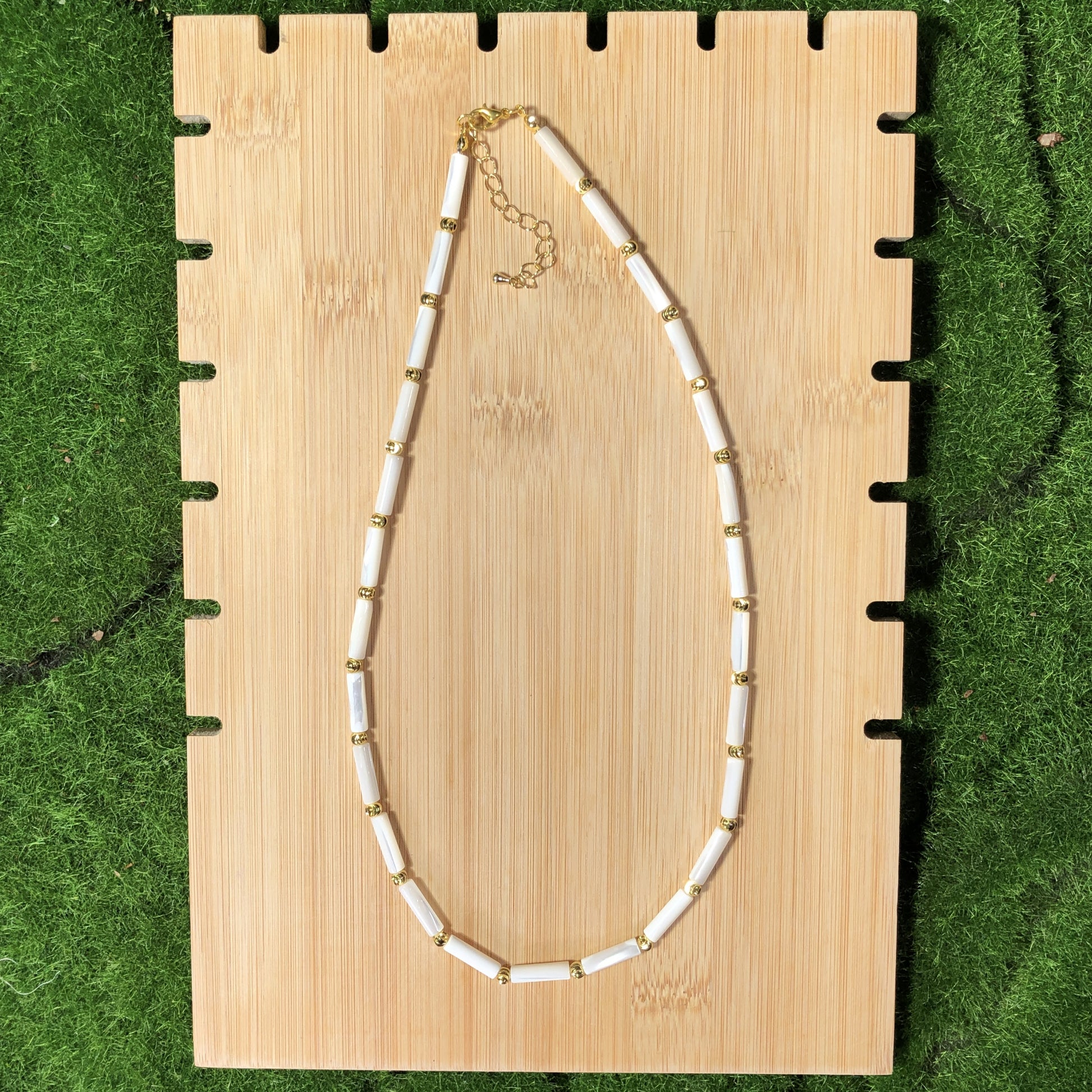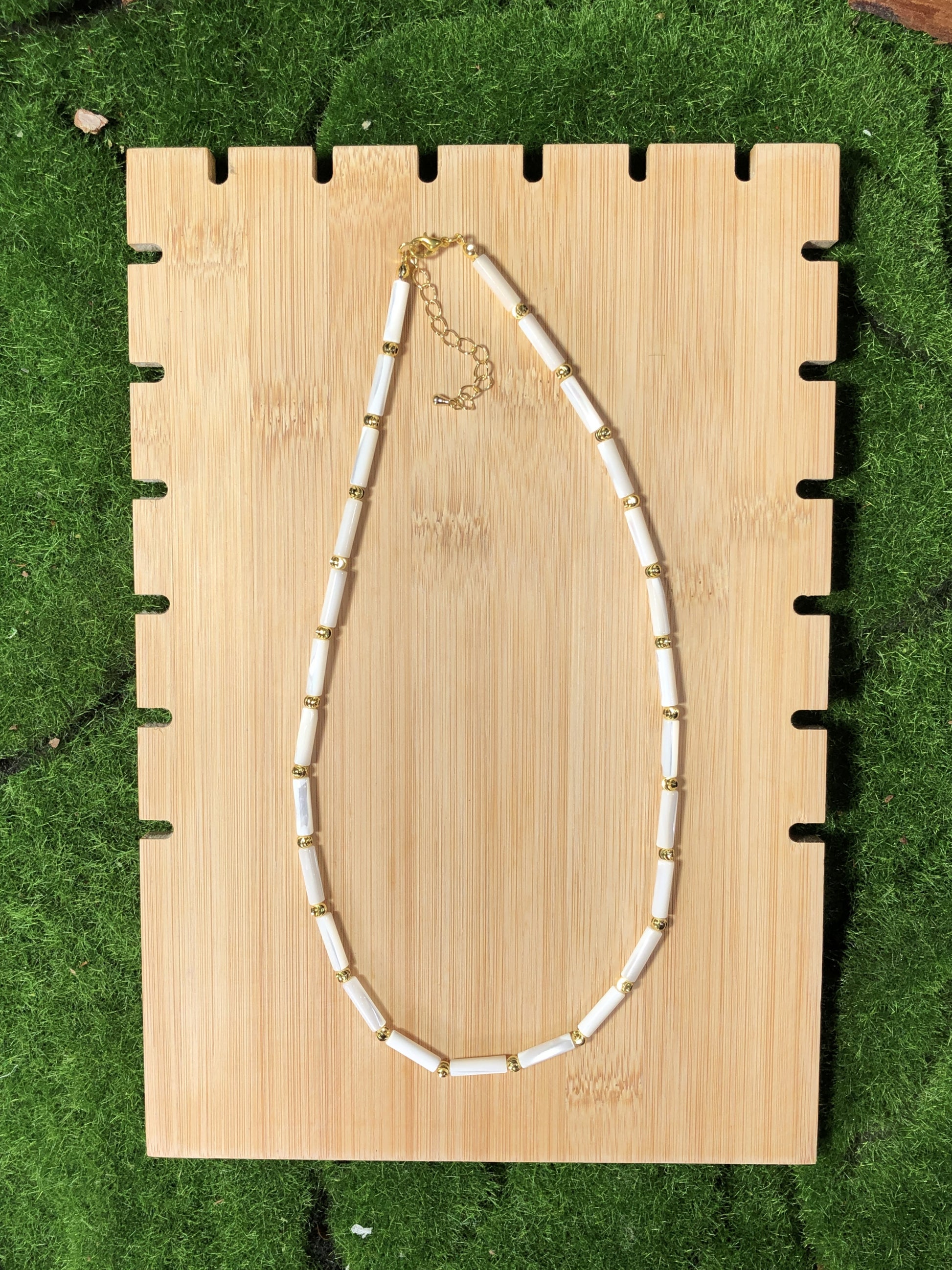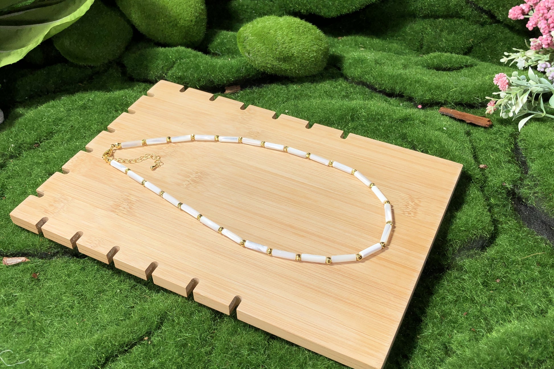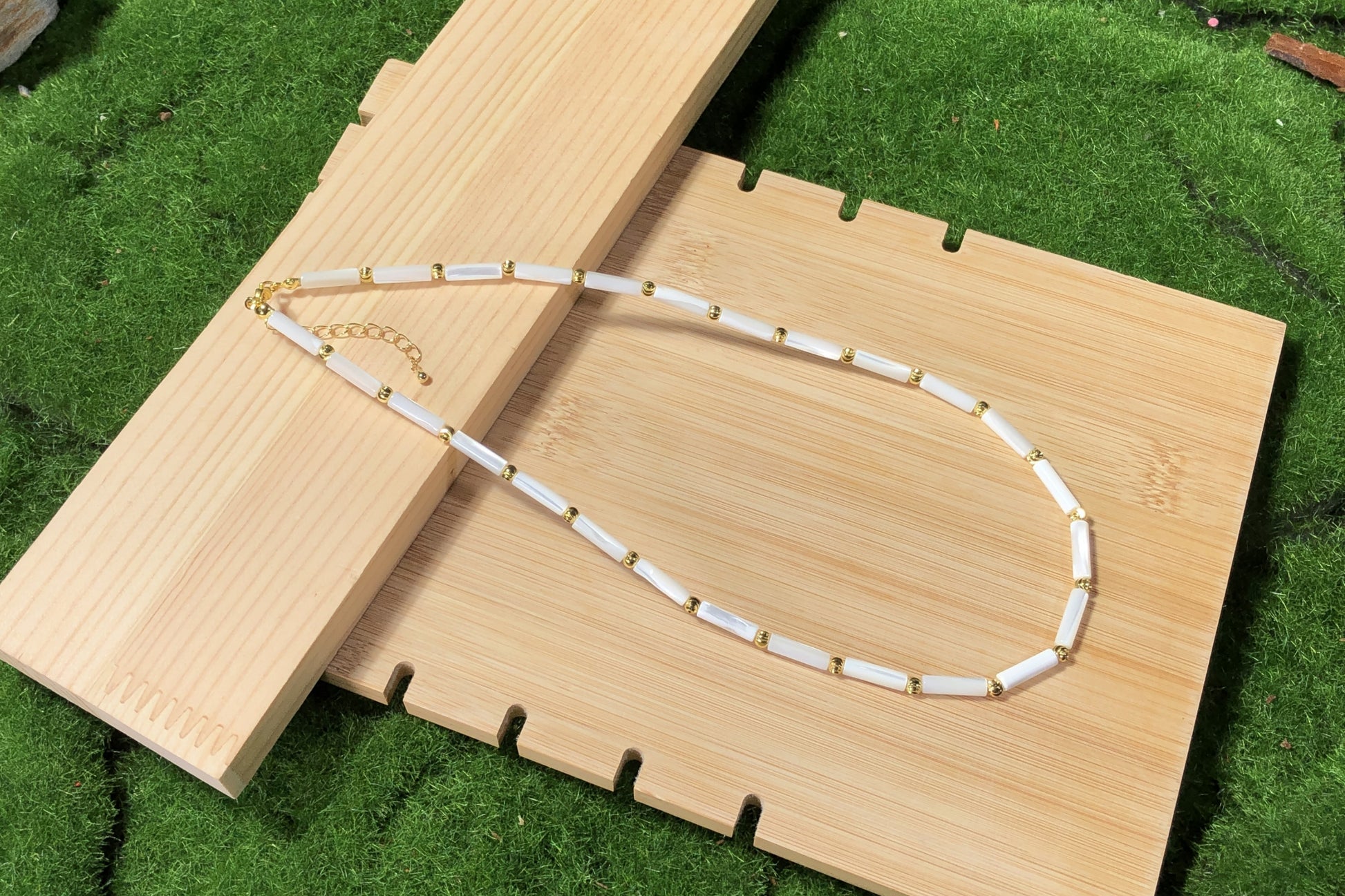 Halskette aus weißer Muschel, 14-karätig vergoldete Kupferkette, handgefertigt.