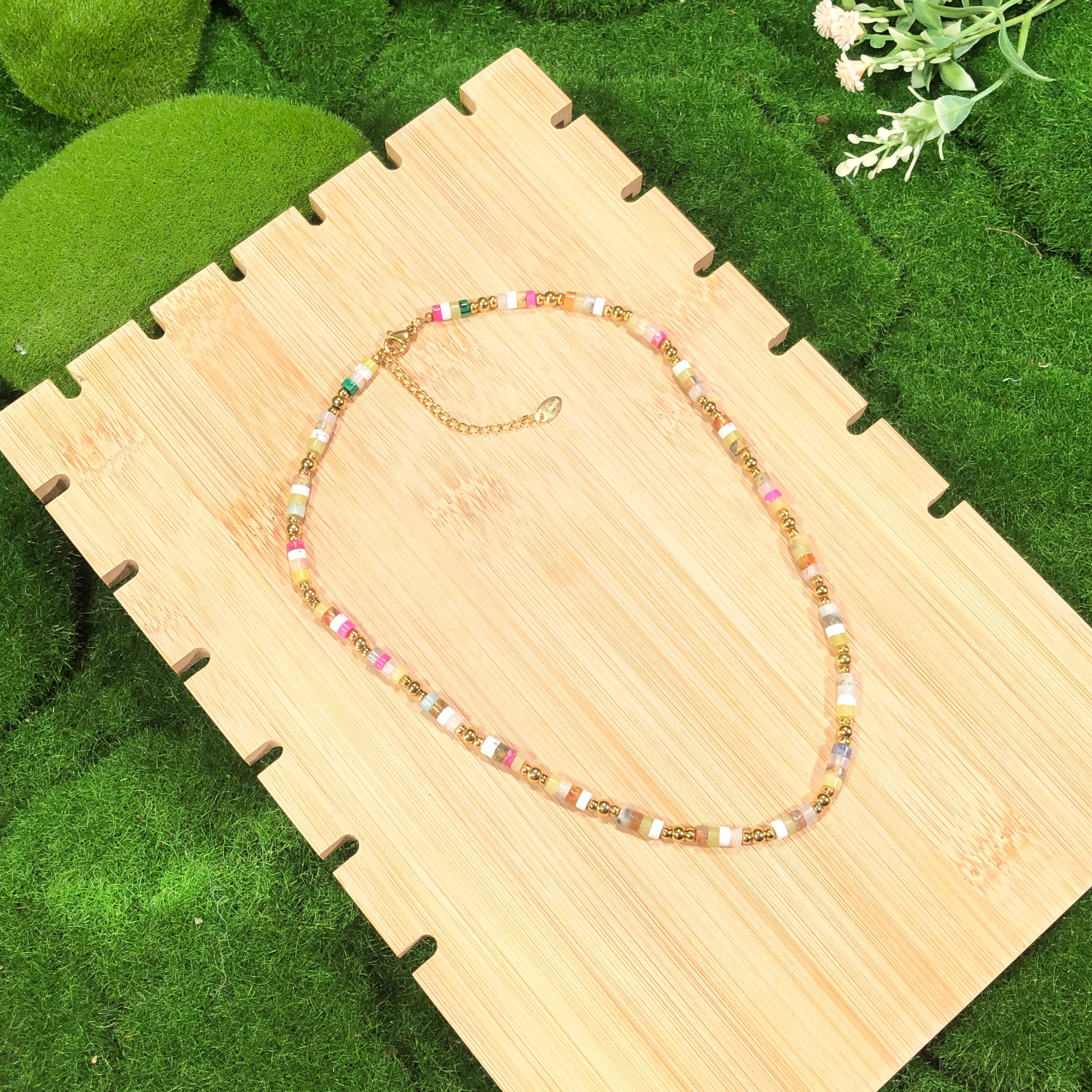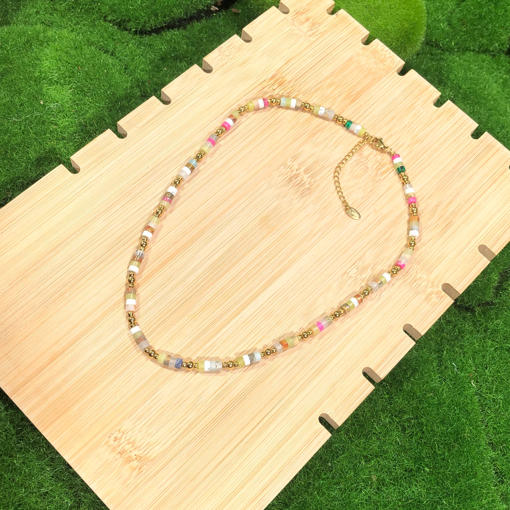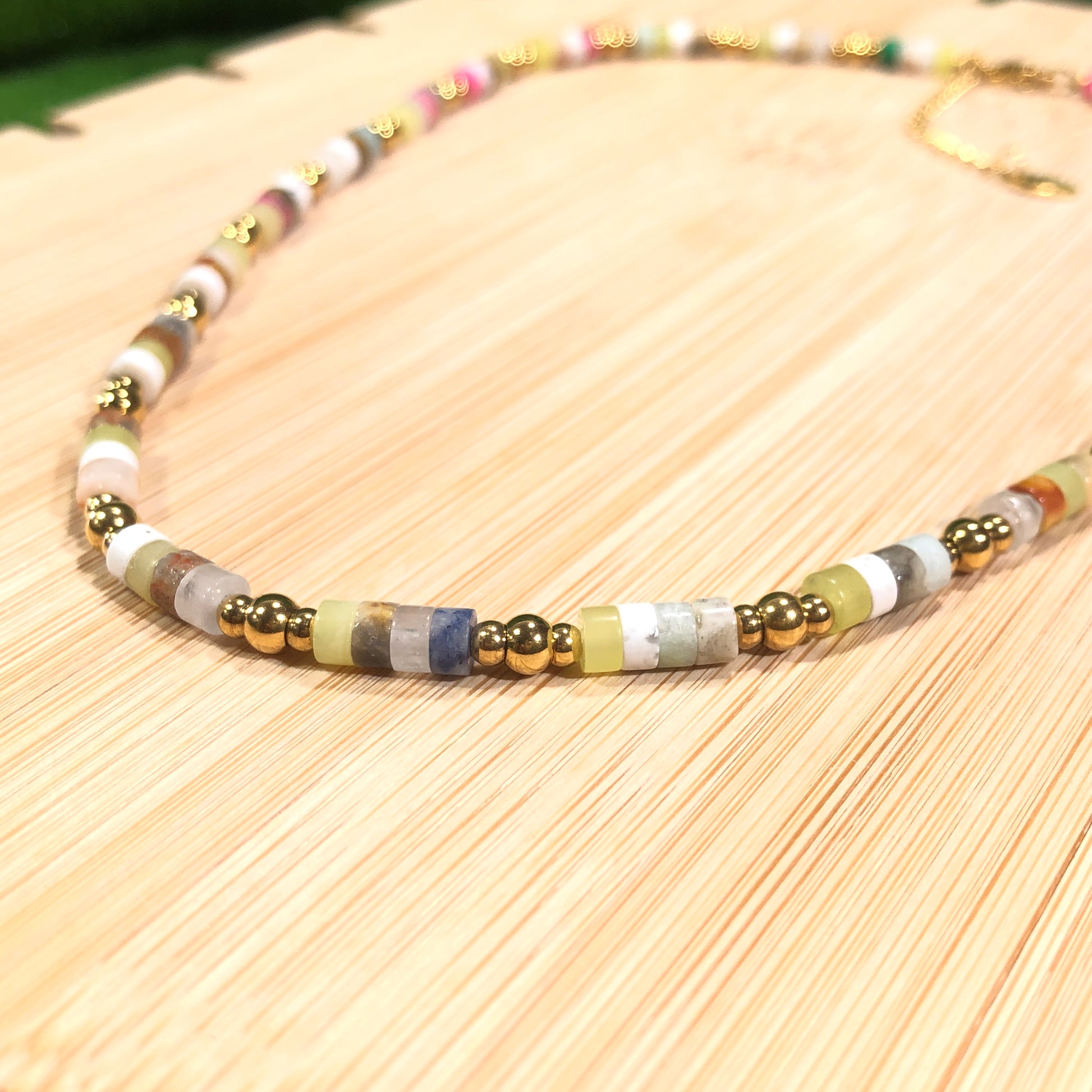 Halskette mit farbigen Edelsteinen, aus 14-karätig vergoldetem Messing, handgefertigt.