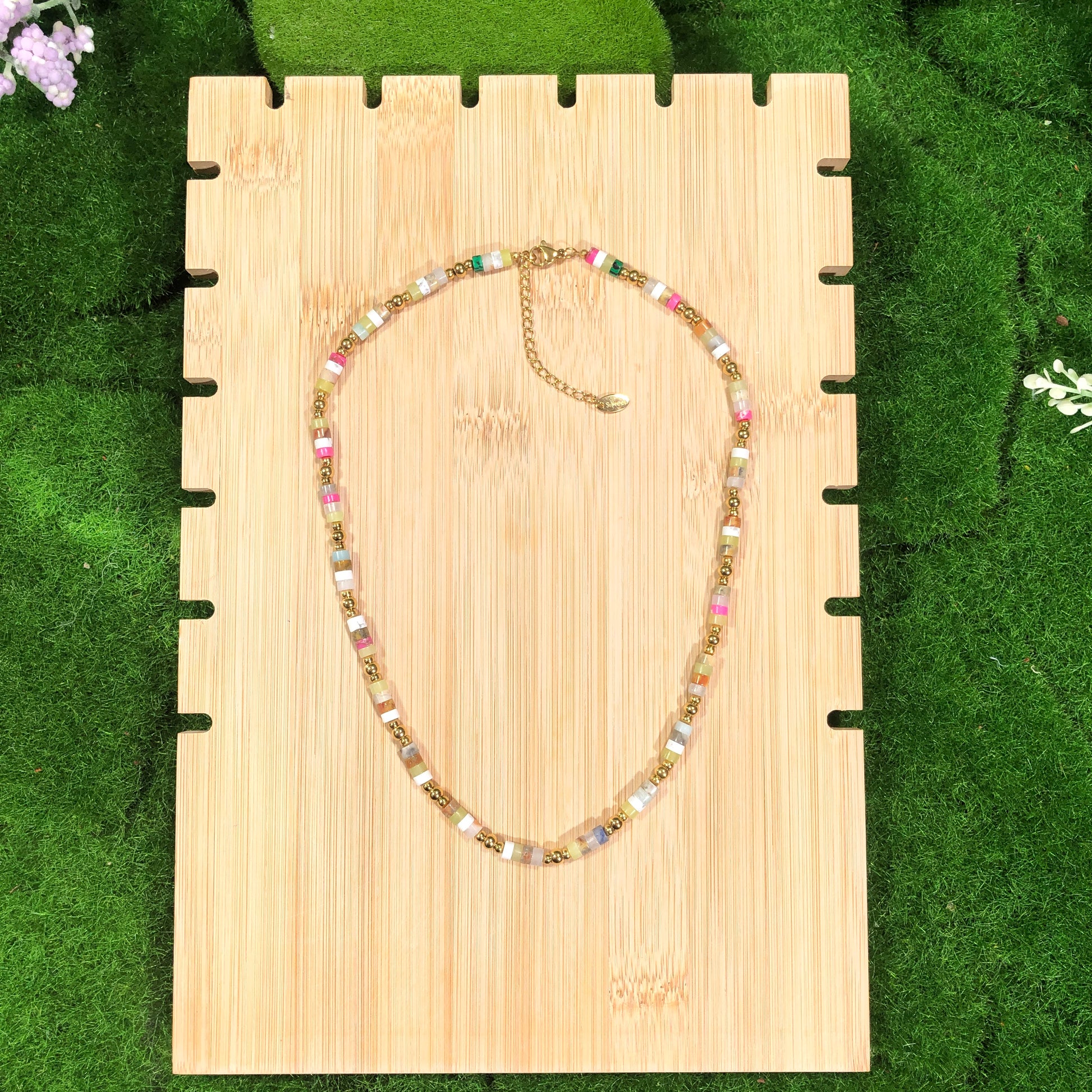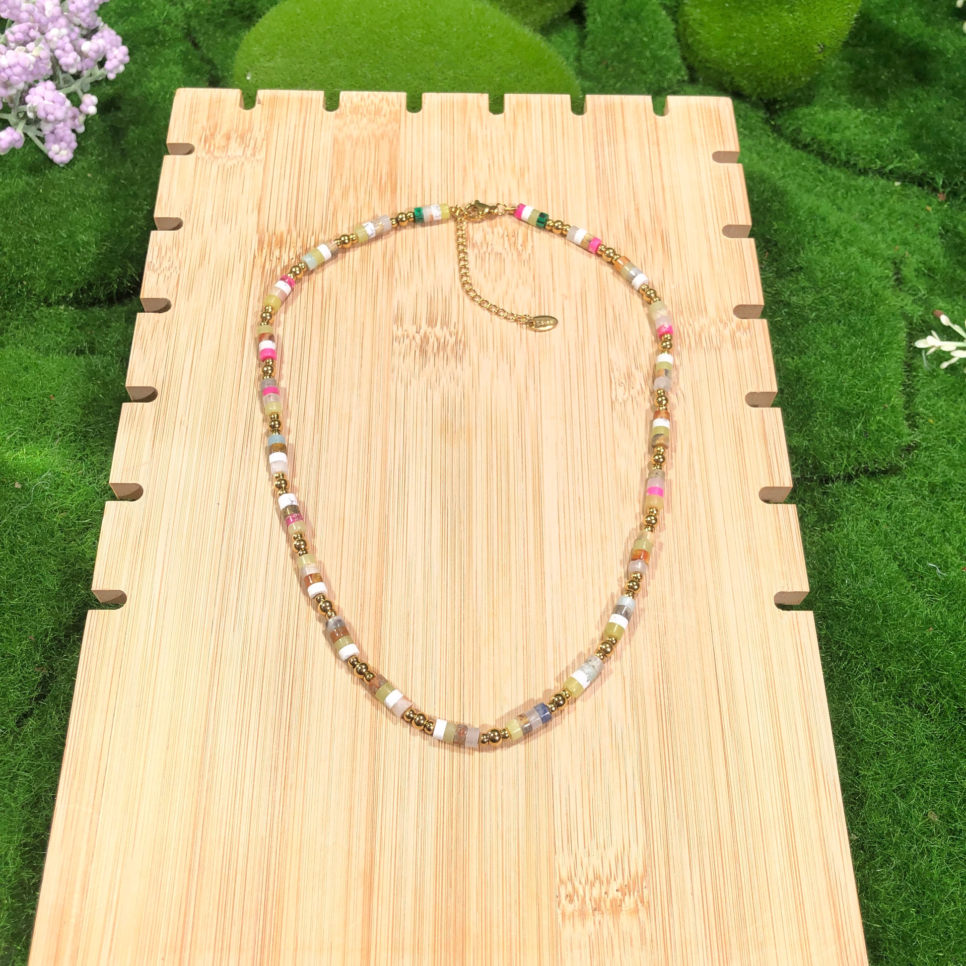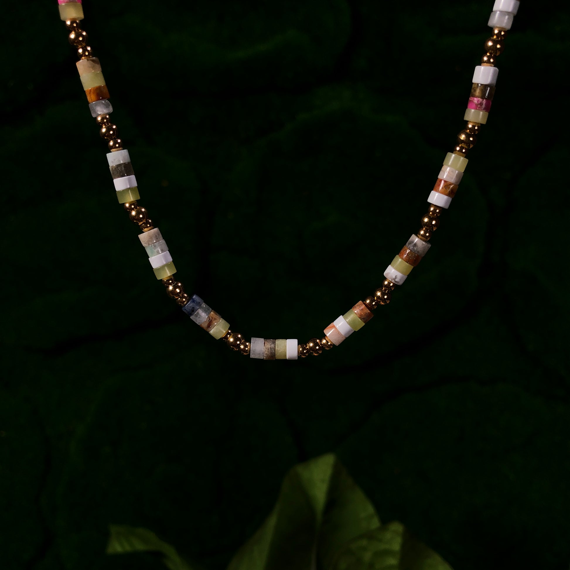 Halskette mit farbigen Edelsteinen, aus 14-karätig vergoldetem Messing, handgefertigt.