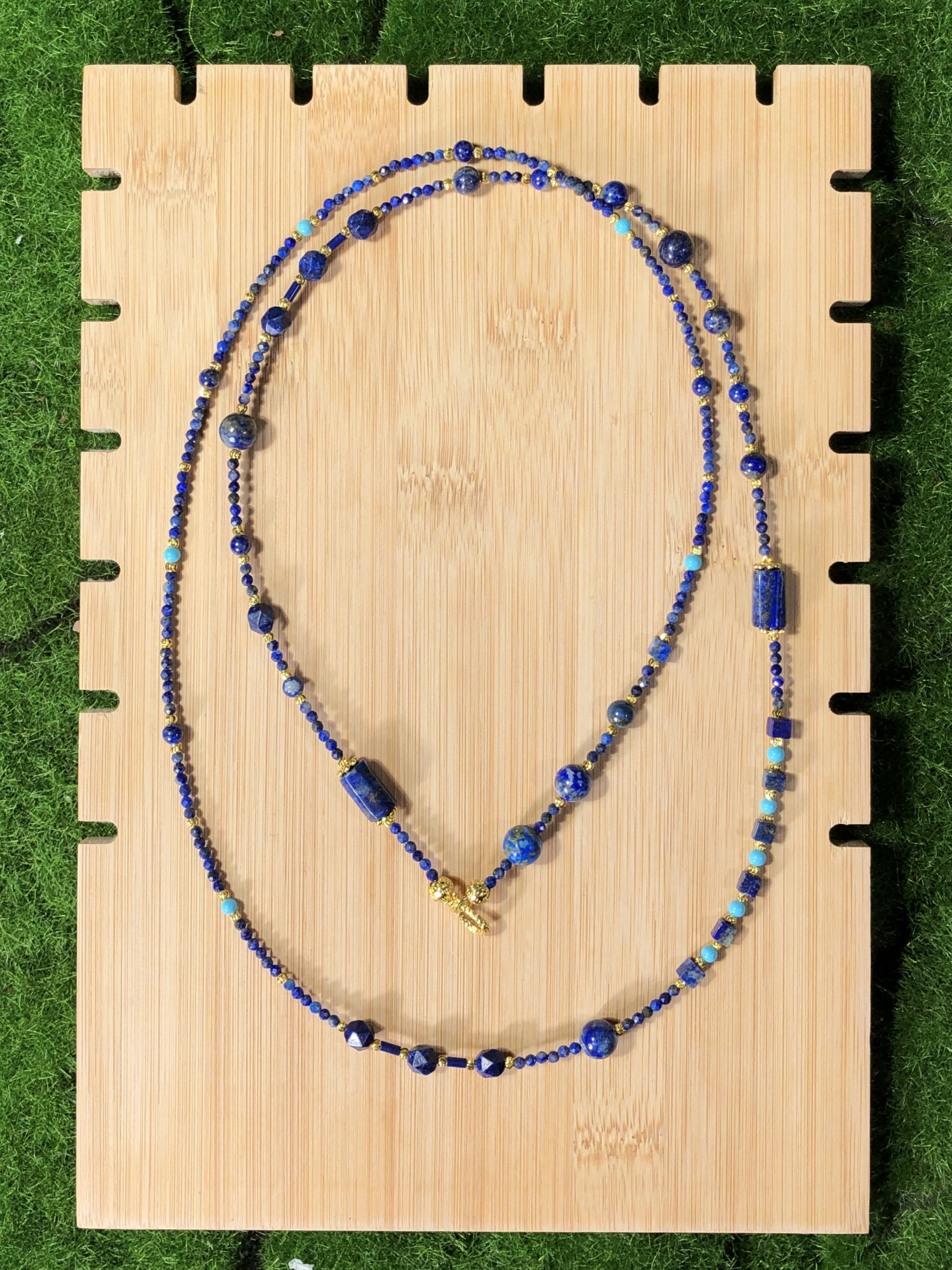 Lange Halskette aus natürlichem Lapislazuli, 14-karätig vergoldete Kupferkette, handgefertigt.