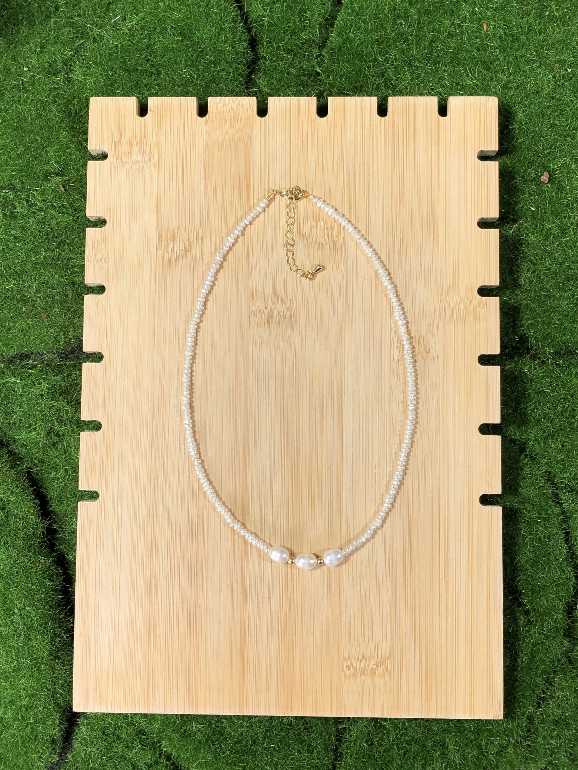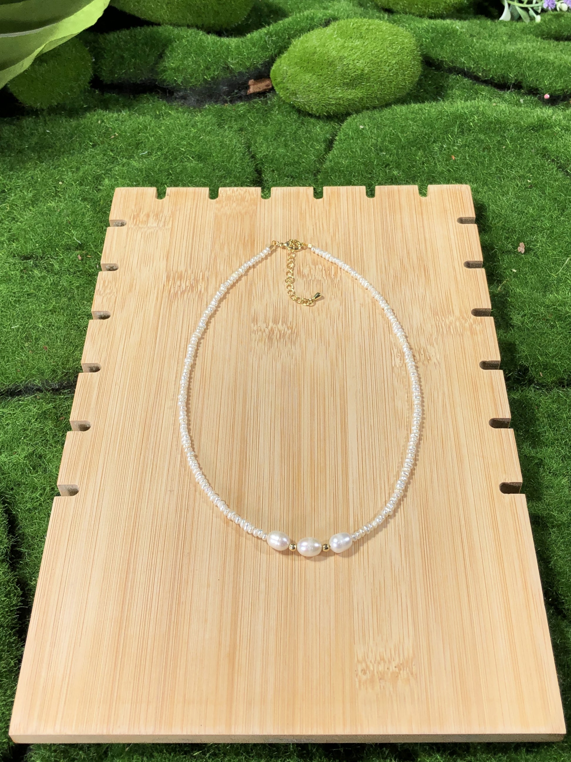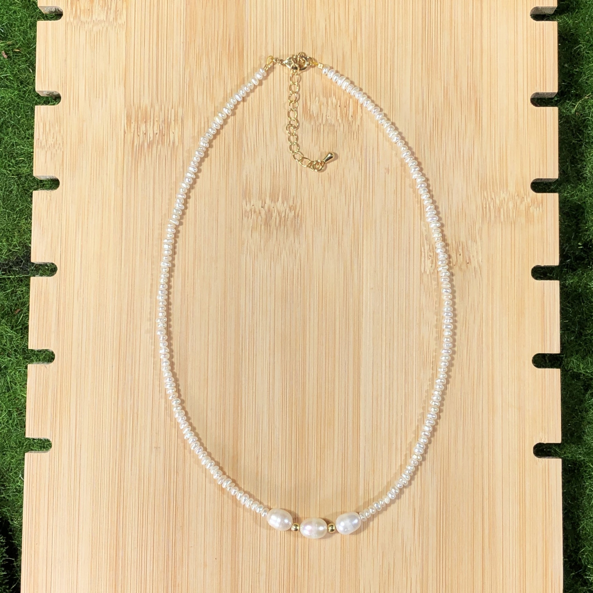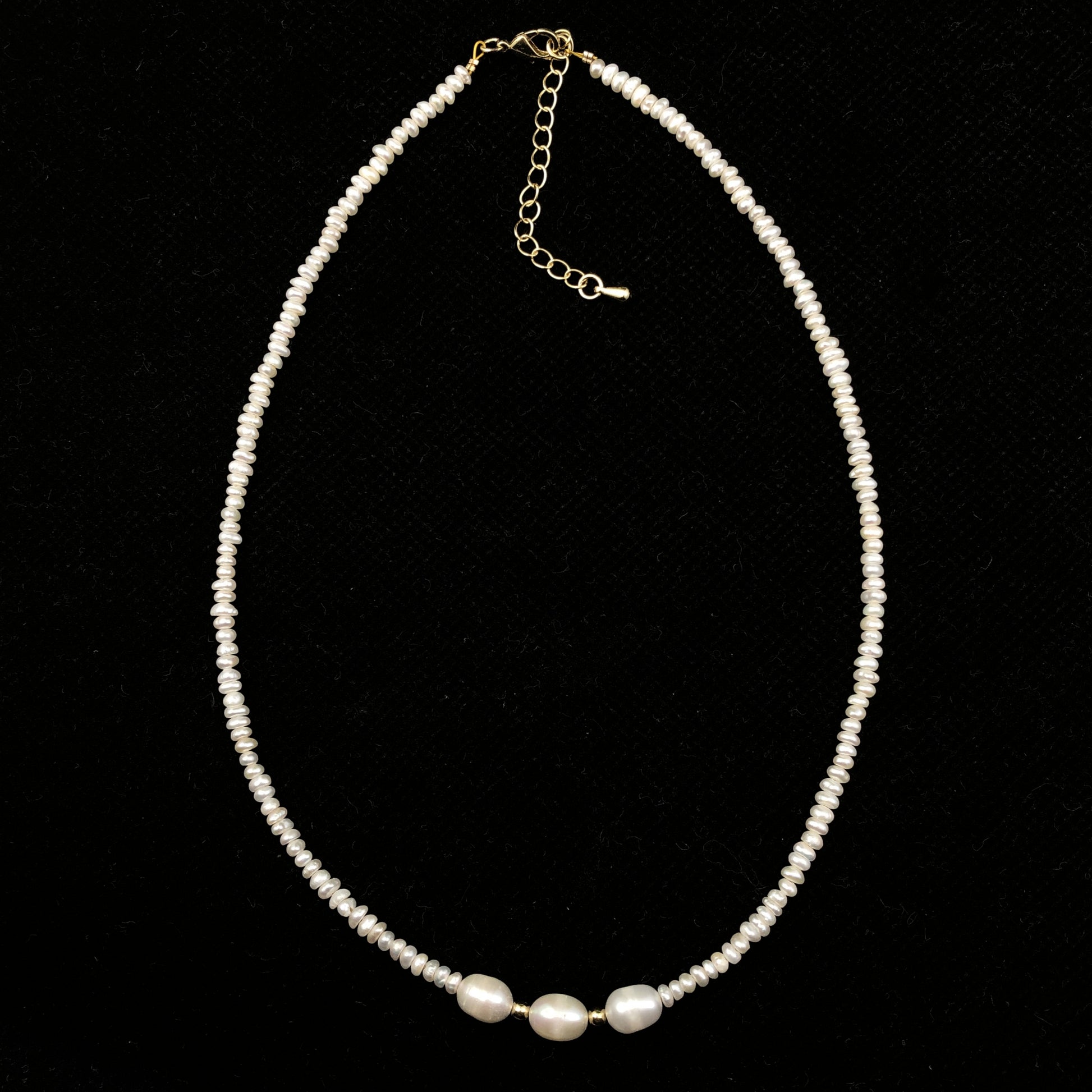 Natürliche Süßwasserperlenkette mit 3 großen Barockperlen, handgefertigt.