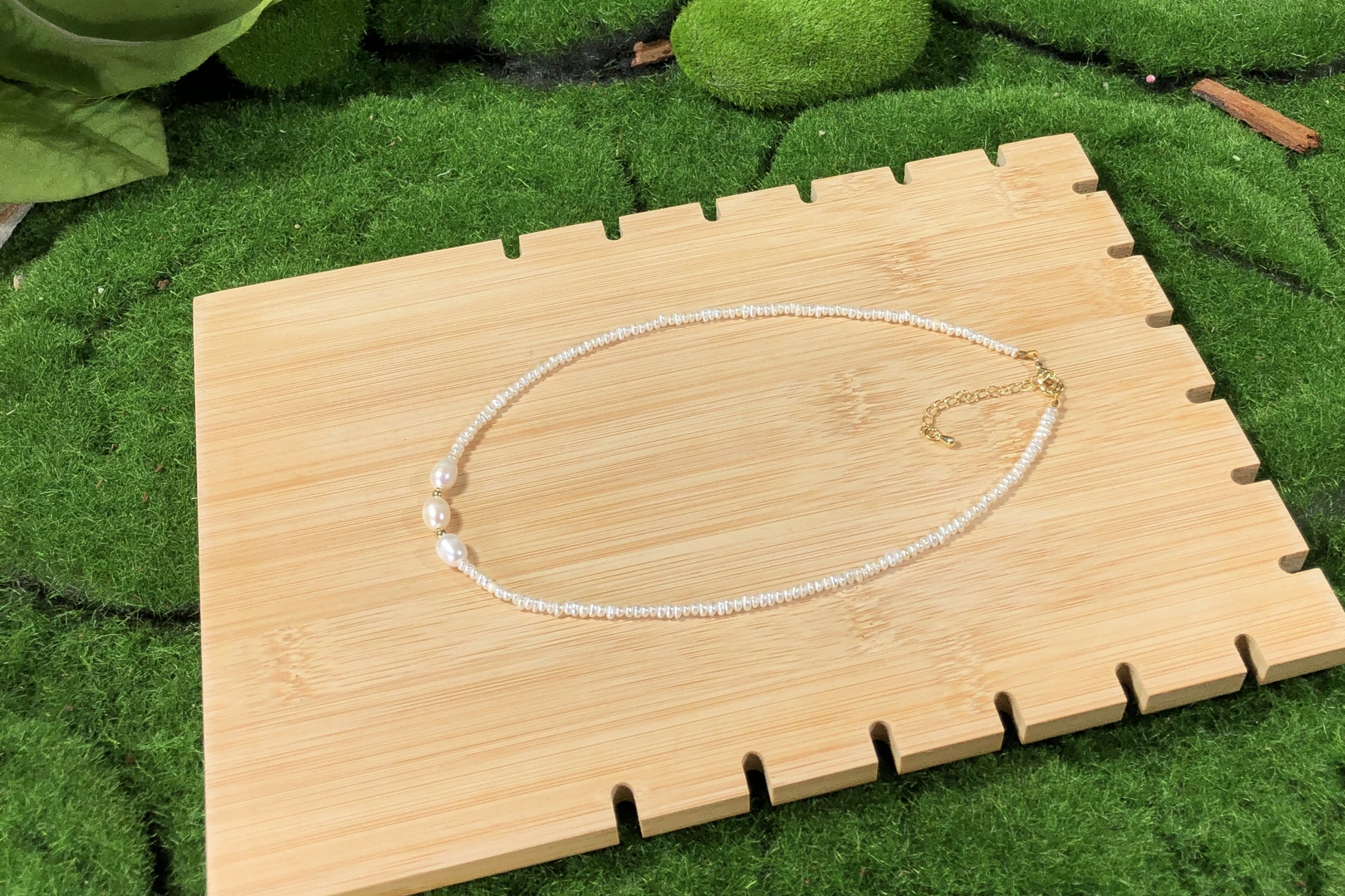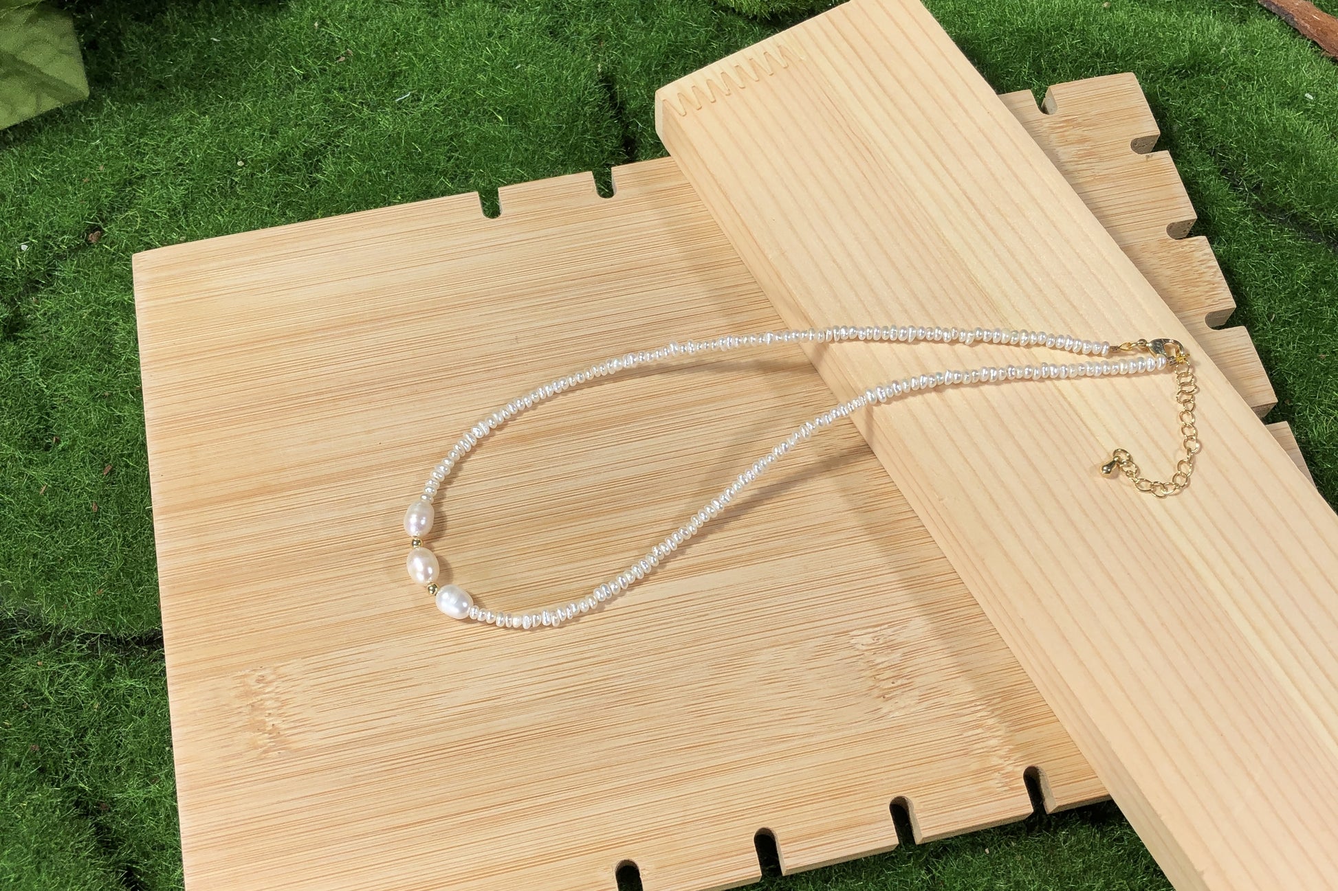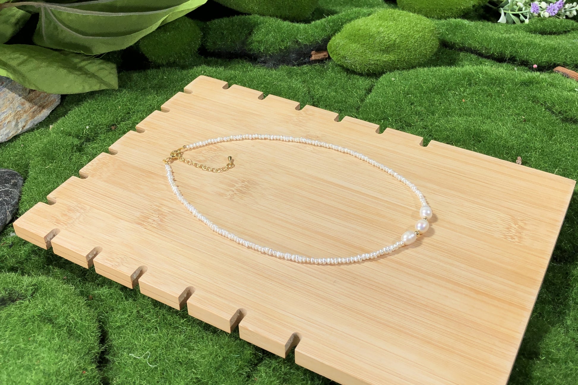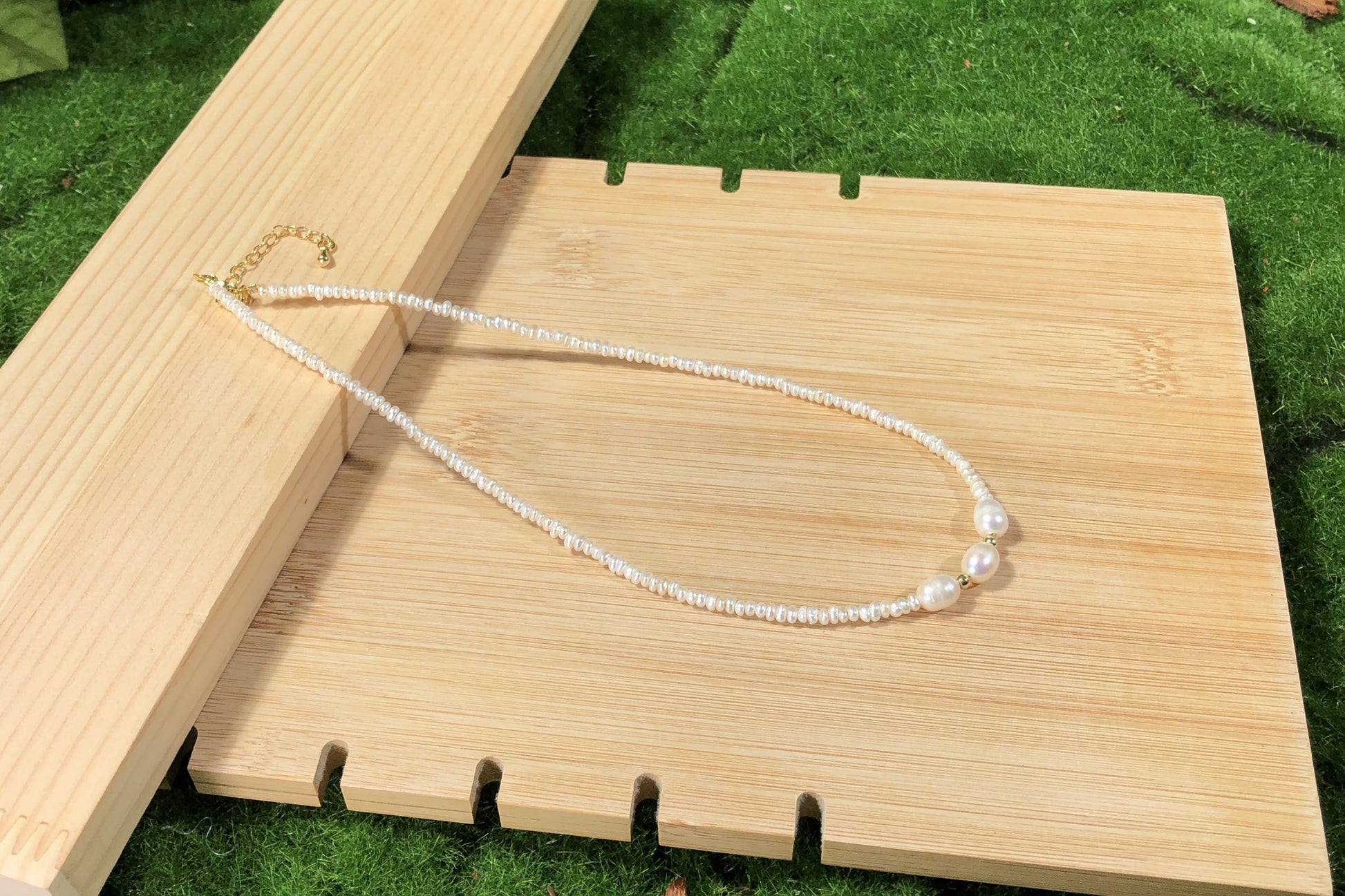 Natürliche Süßwasserperlenkette mit 3 großen Barockperlen, handgefertigt.