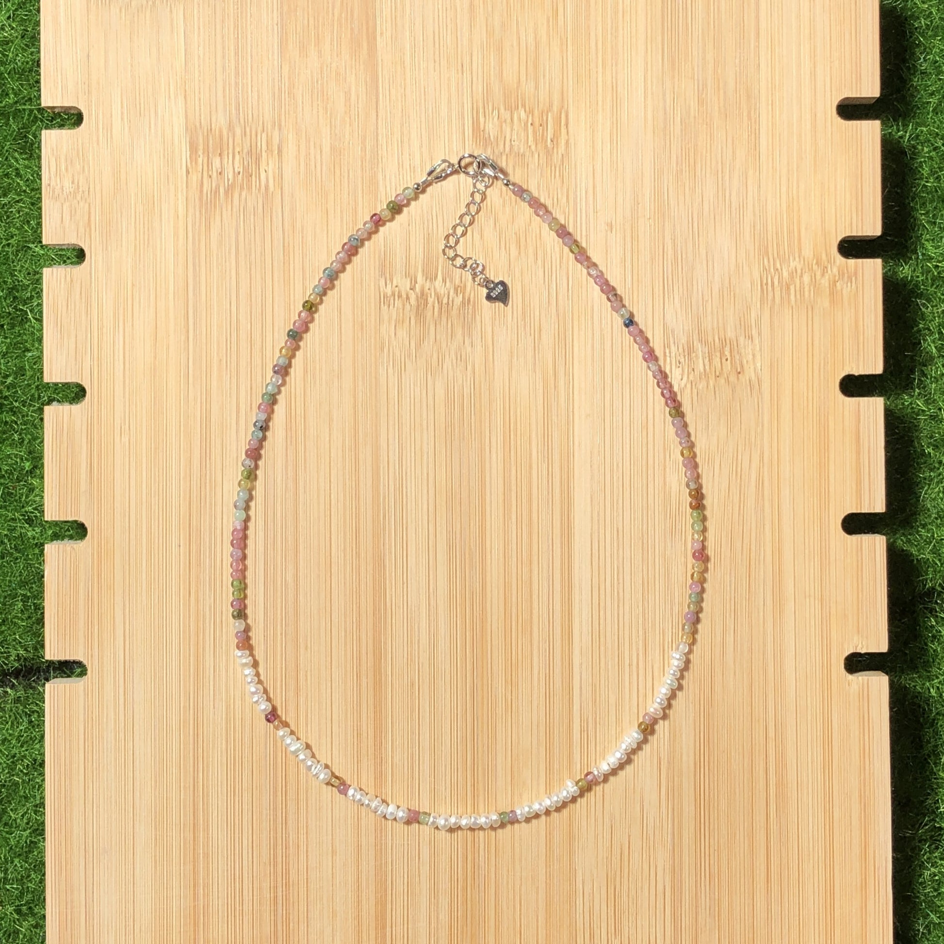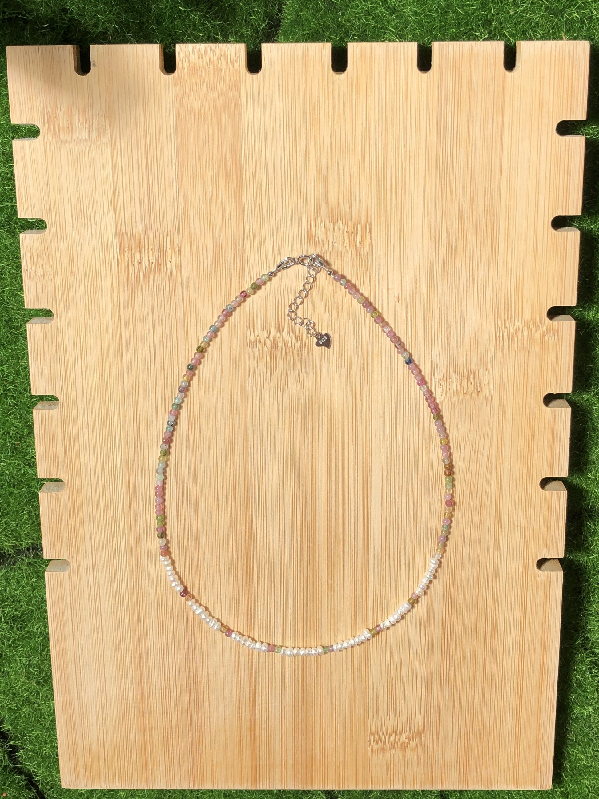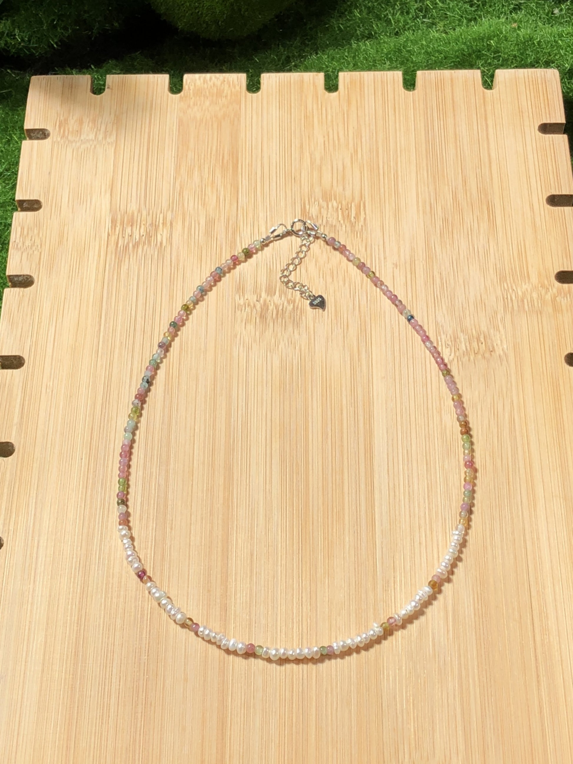 Natürliche Turmalin- und Süßwasserperlenkette, handgefertigt.
