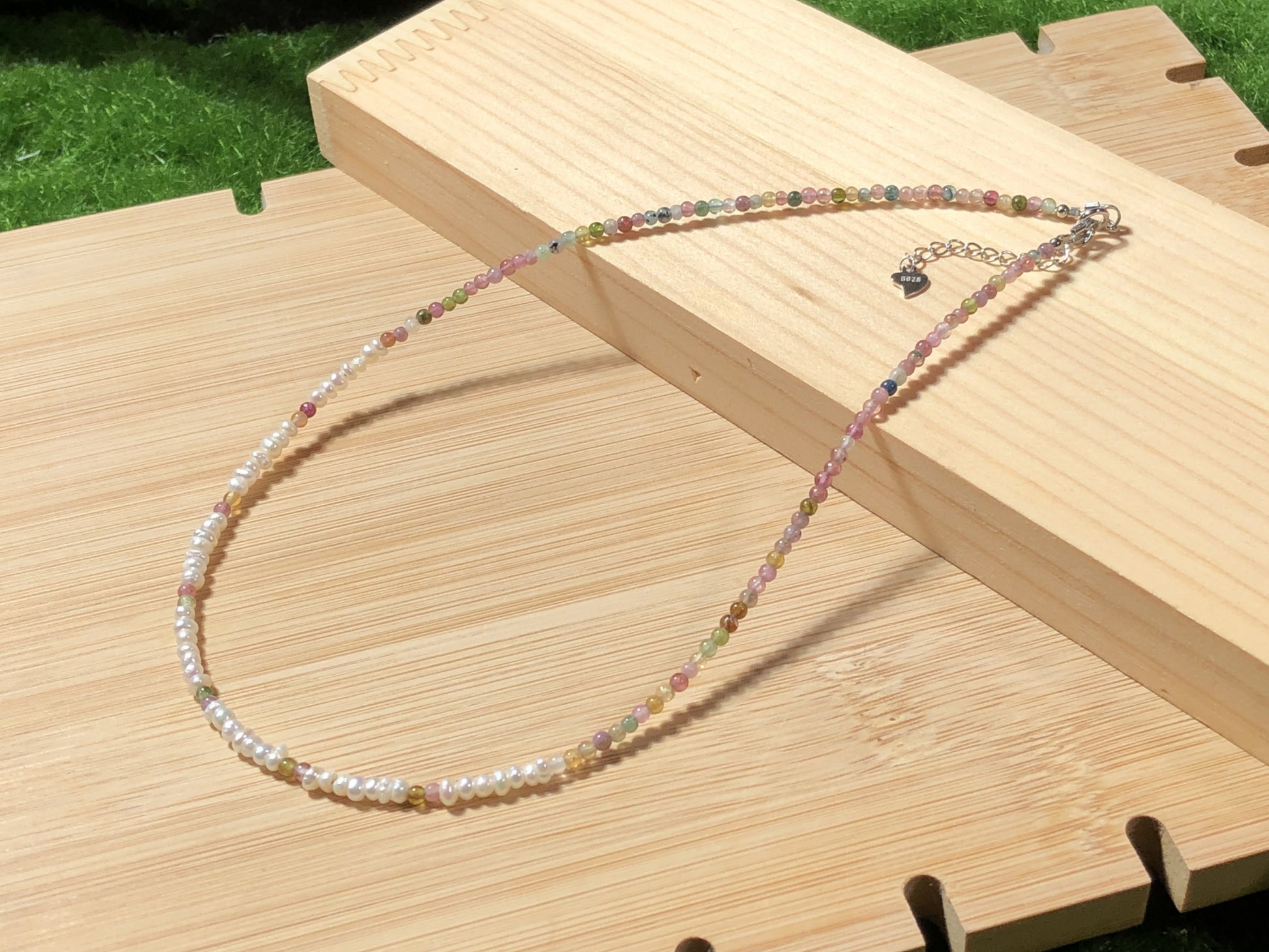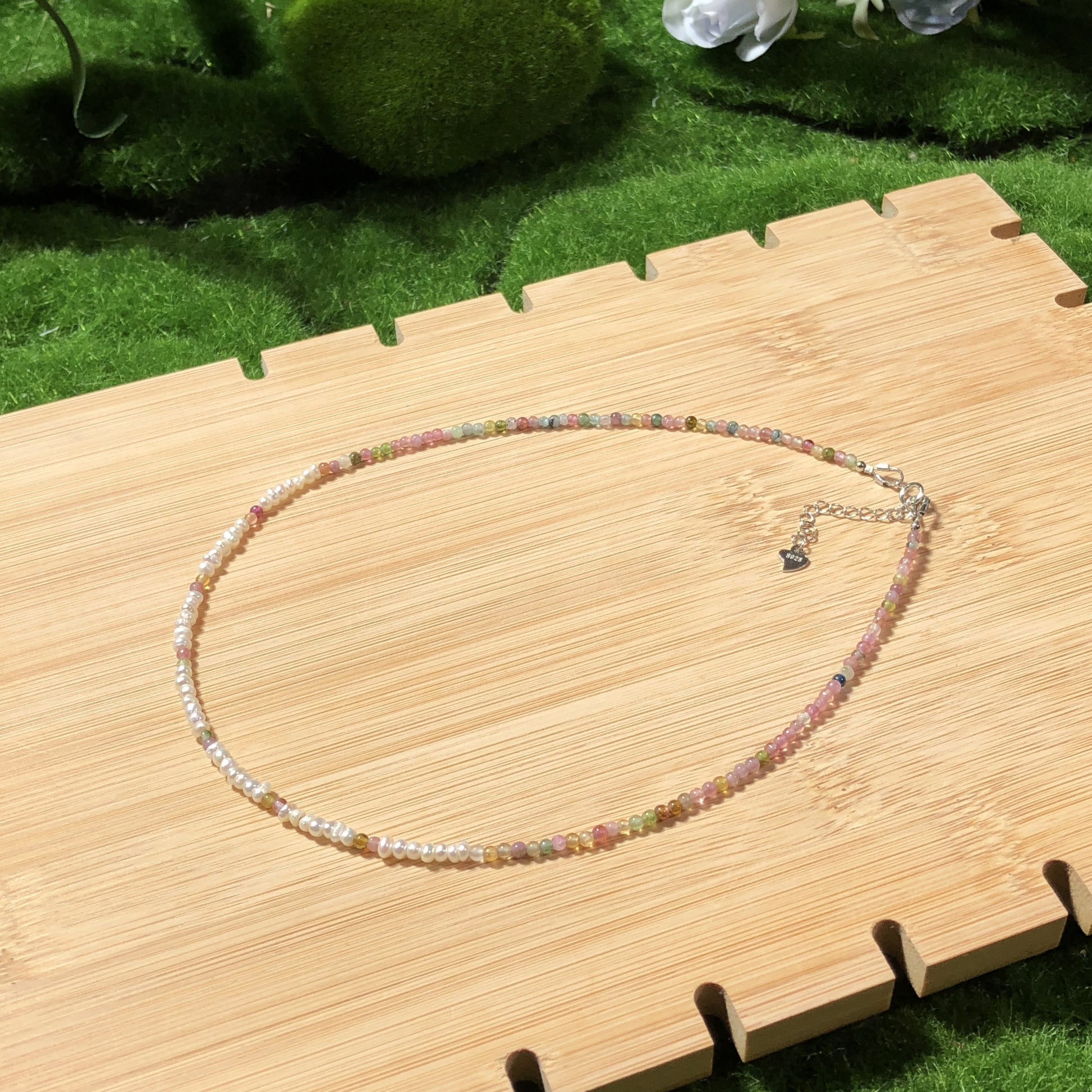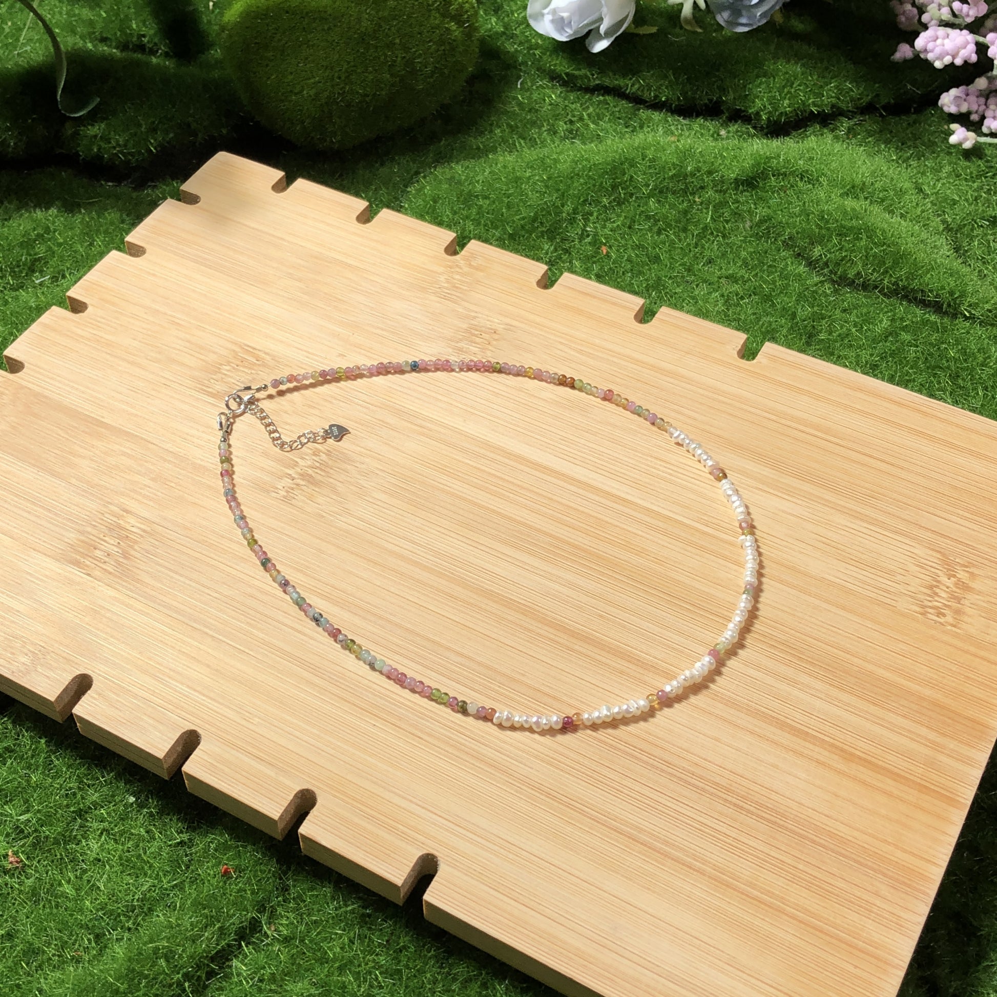 Natürliche Turmalin- und Süßwasserperlenkette, handgefertigt.