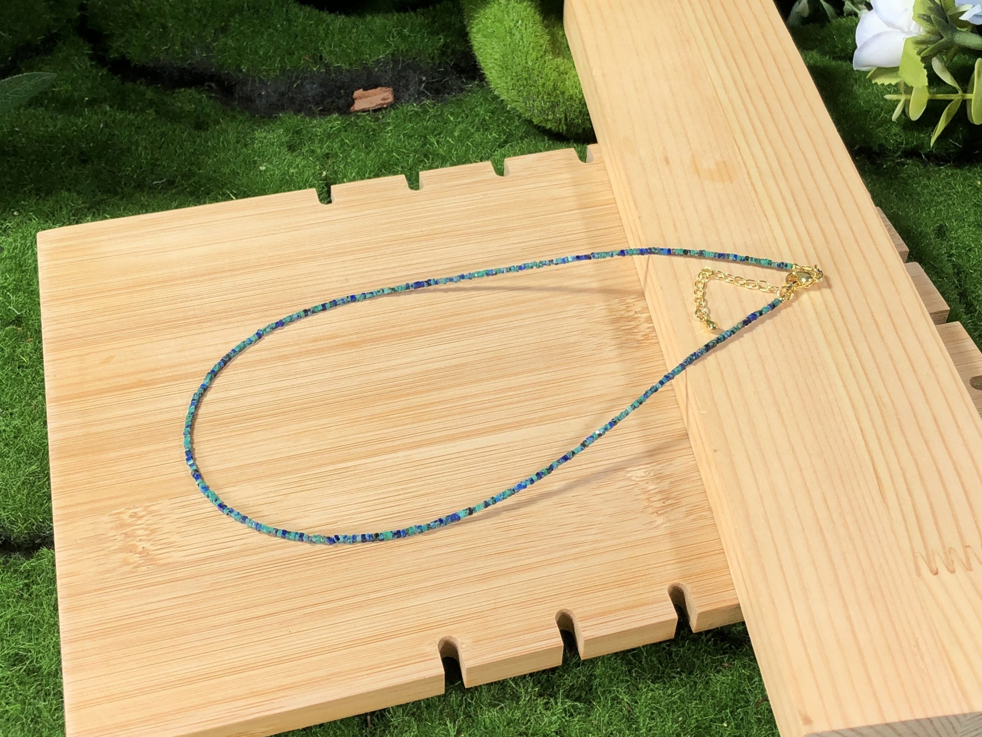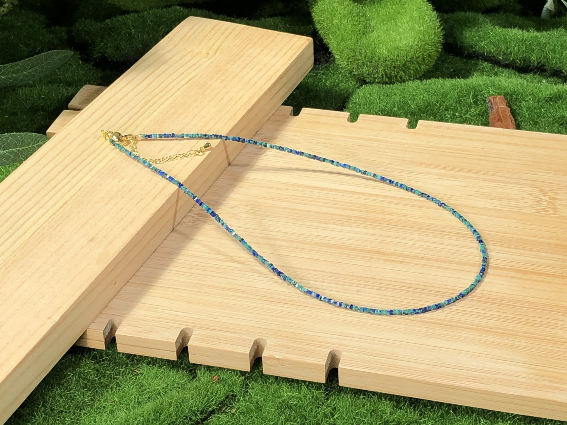 Halskette aus natürlichem Phönix-Lapislazuli, kupferplattiert mit 14-karätigem Gold, handgefertigt.